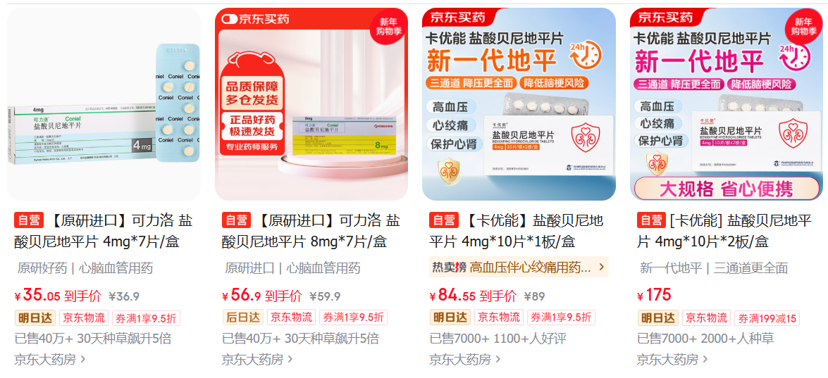 查询京东自营价格发现,“卡优能”的售价大幅高于贝尼地平原研药