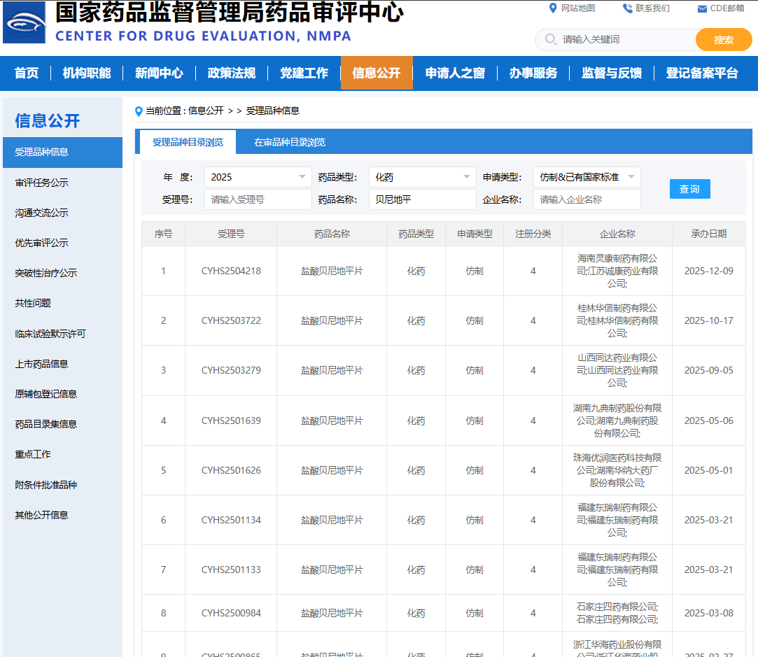 2025年有8家药厂提交了盐酸贝尼地平片的仿制药申报