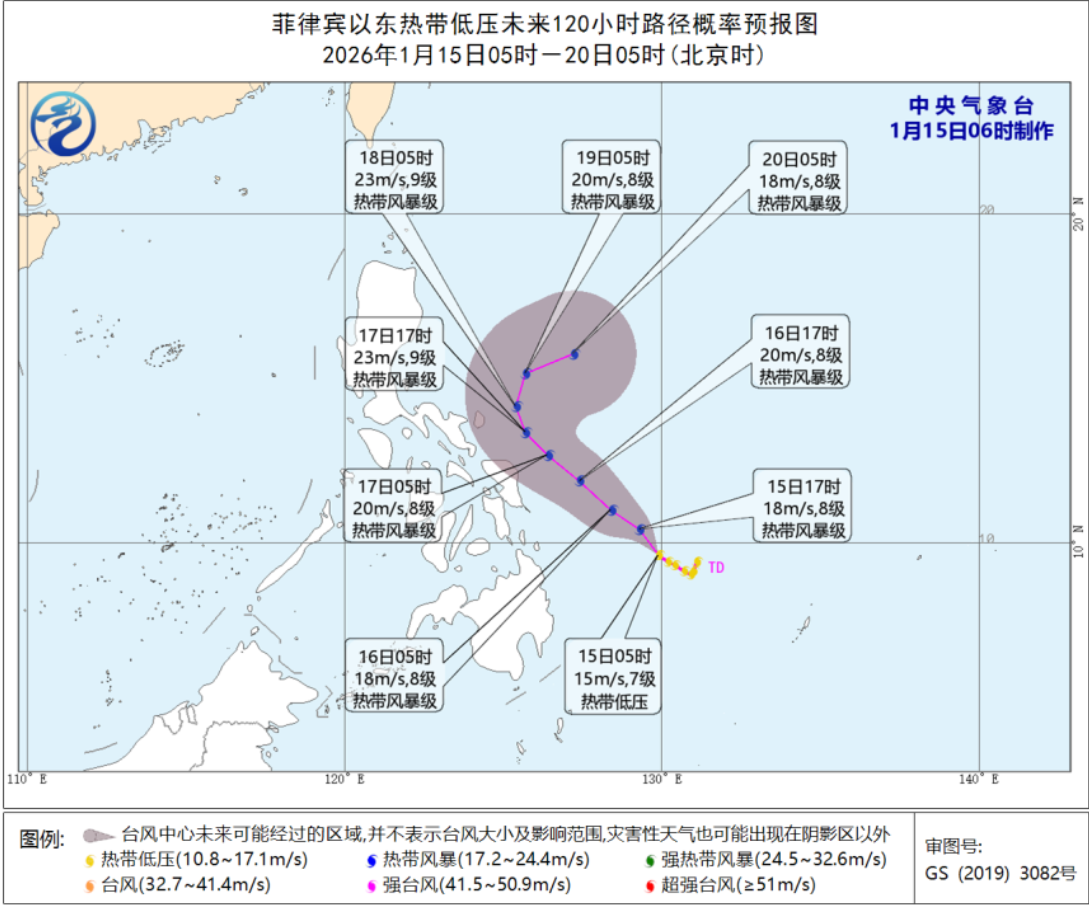 在14日上午,位于菲律宾以东洋面的热带扰动已加强为热带低压。截至15日5时,该热带低压位于距离菲律宾马尼拉东偏南方向约1120公里的海上,最大风力7级。