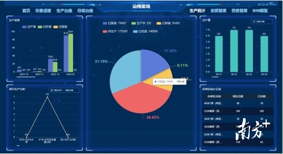 自2023年7月进场以来,中铁十一局智慧梁场始终坚持“绿色公路、智慧建设”管理理念,积极推动“八个工程”体系落实落地,通过引进互联网、物联网技术,一方面完善现有的信息管理系统,结合BIM可视化云平台技术,从材料进场、试验检测、各工序施工、成品检测、成品梁出库等流程管控信息集成;另一方面对施工设备进行研发改造,结合生产线内的移动底模、液压侧模、蒸汽养生、智能张拉压浆、智能喷淋等各项智能化系统,实现预制场生产有序、高效,低成本地运行,打造绿色智能梁场。