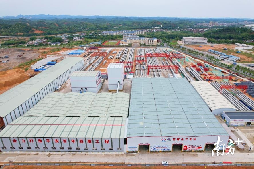 作为汕梅高速改扩建工程全线规模最大的梁场,中铁十一局智慧梁场承担了全线过半标段4230片梁板的预制任务。梁场位于梅州市畲江工业园区,占地199亩,面积54830㎡,设置有1套中央信息化指挥平台及3个智慧生产车间,每个车间设有3条智慧化流水生产线,每条生产线日均产梁1片,梁场月产梁可达270片。每个车间配置12台信息化移动台座,智能液压整体钢模具和智能振捣系统各3套,智能张拉压浆系统和智能蒸养系统各1套。