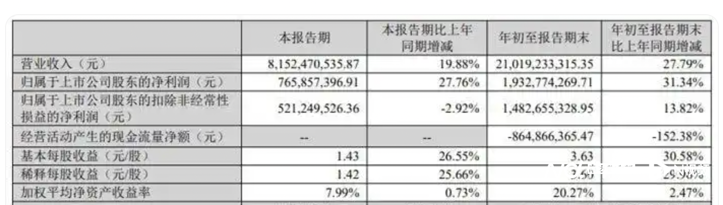 聚焦第三季度,公司实现营业收入81.52亿元,同比增长19.88%——但增速为2023年第一季度以来最低。而在盈利方面,其归母净利润为7.66亿元,同比增长27.76%;扣非归母净利润为5.21亿元,同比小幅下降2.92%。