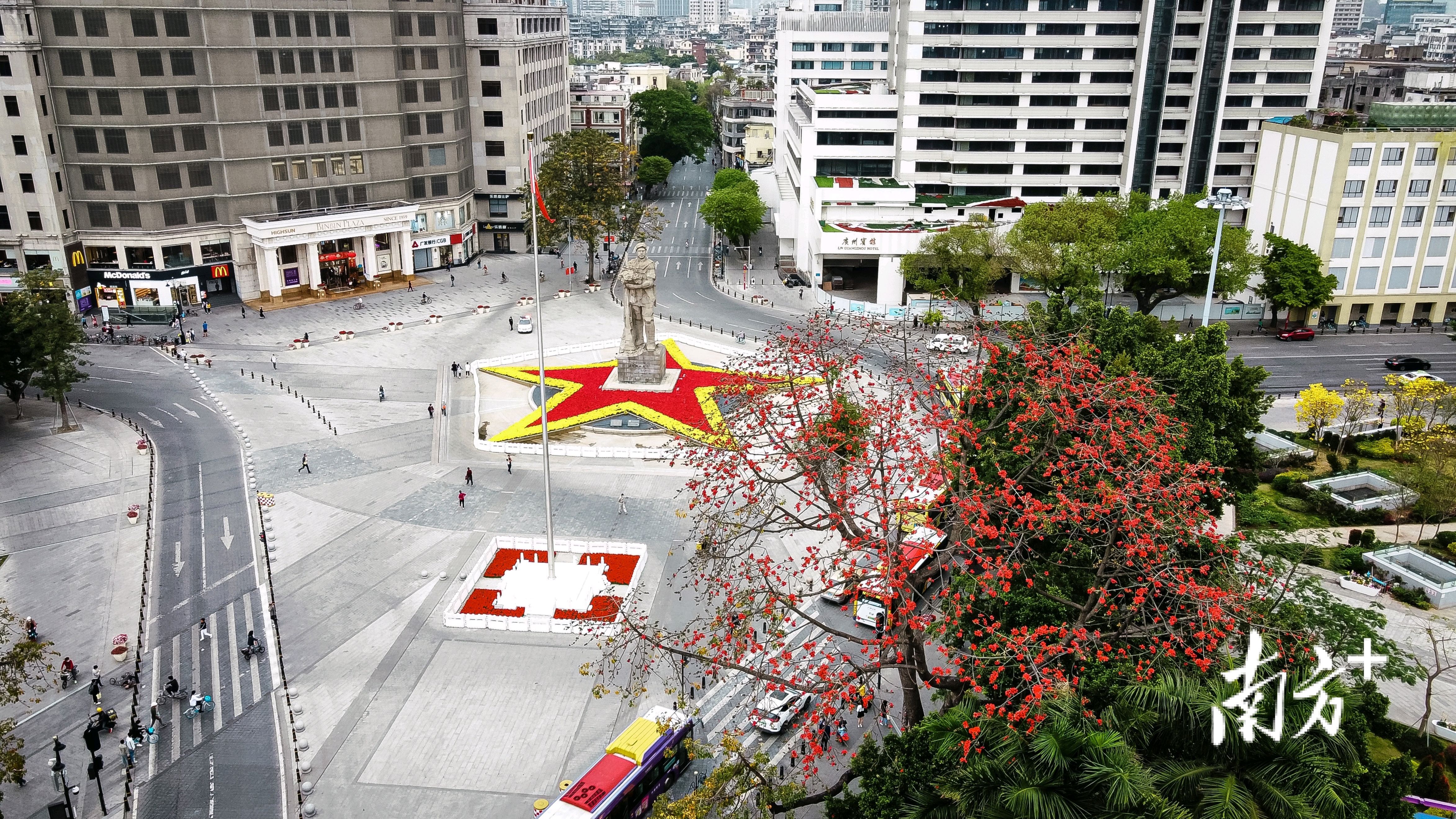 广场中央的广州解放纪念像持枪捧花,基座上“一切权力属于人民”的字迹熠熠生辉。