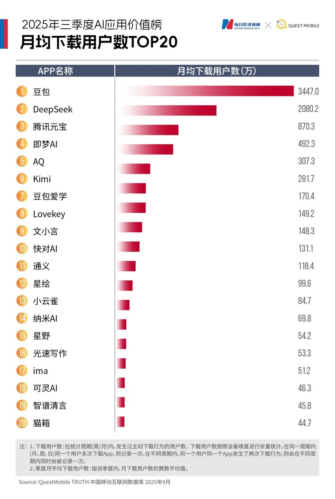 2025年第三季度,AI应用市场呈现出明显的两极分化。《每日经济新闻》联合QuestMobile推出《2025年三季度AI应用价值榜》,基于月均下载量与月活跃用户数(以下简称“月活”)两大核心指标,揭示AI应用“下半场”的新变局。