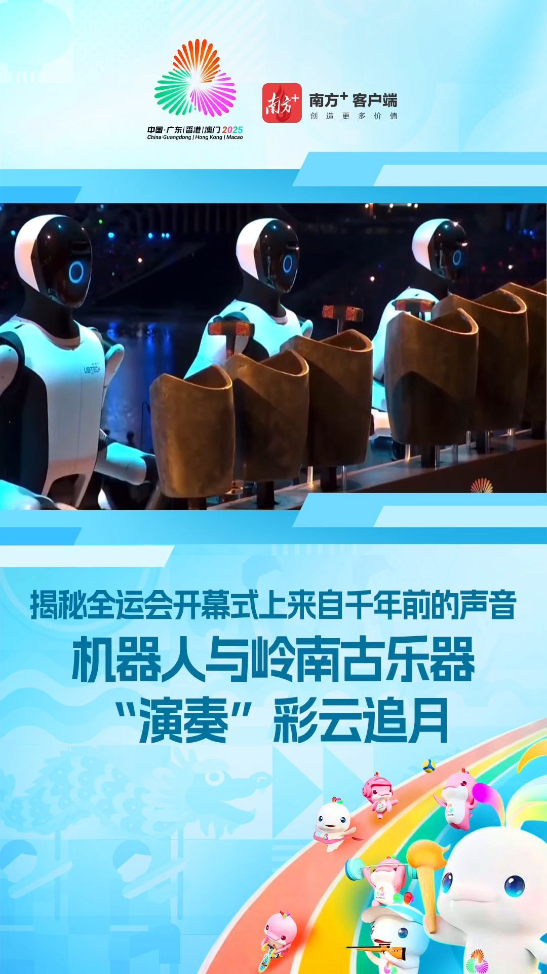 象征粤港澳三地的三个机器人整齐划一地“敲响”铜句鑃仿制品,舞台上响起《彩云追月》的动人音符。