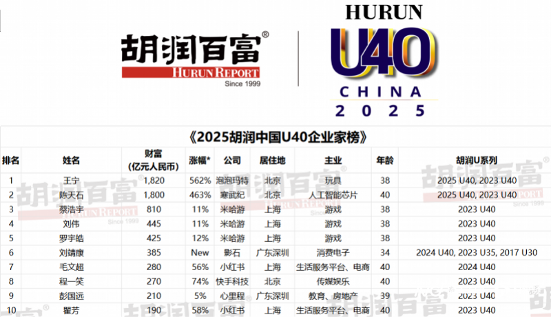 在《2025胡润中国U40企业家榜》中,排名最高的深圳企业家是智能影像设备企业影石创始人刘靖康,年龄为34岁,身家达385亿。此前他曾登上过胡润2017年U30、2023年U35、2024年U40等系列榜单。值得一提的是,受益于短视频的热度与全球智能硬件需求的持续释放,刘靖康与其妻子潘瑶今年还首次登上了此前发布的《2025年胡润百富榜》。