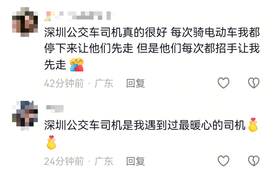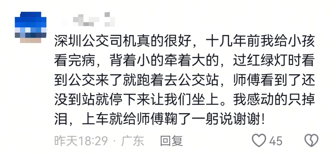 不过,包建红口中的这个“很普通的举动”被路过的热心网友拍摄记录下来,上传到短视频平台上,并配文:“我跟了一段路才想起记录一下,这公交车司机早早就开始放很慢速度了,就是为了等这对母子,深圳公交车司机真的都好好,好贴老百姓的心啊。”这段由旁观者发出的感叹迅速引发广大网友的情感共鸣,纷纷为深圳公交司机点赞。