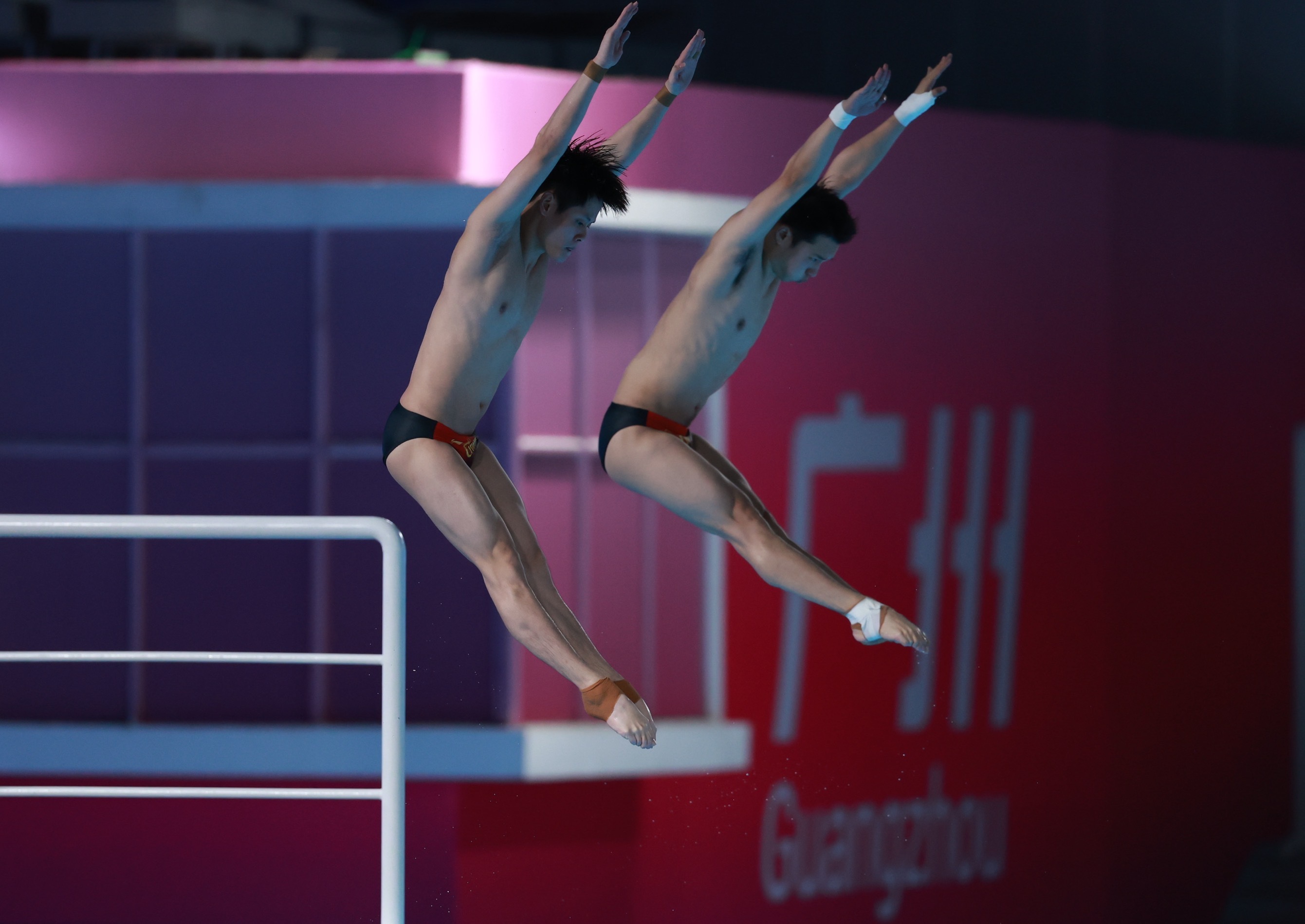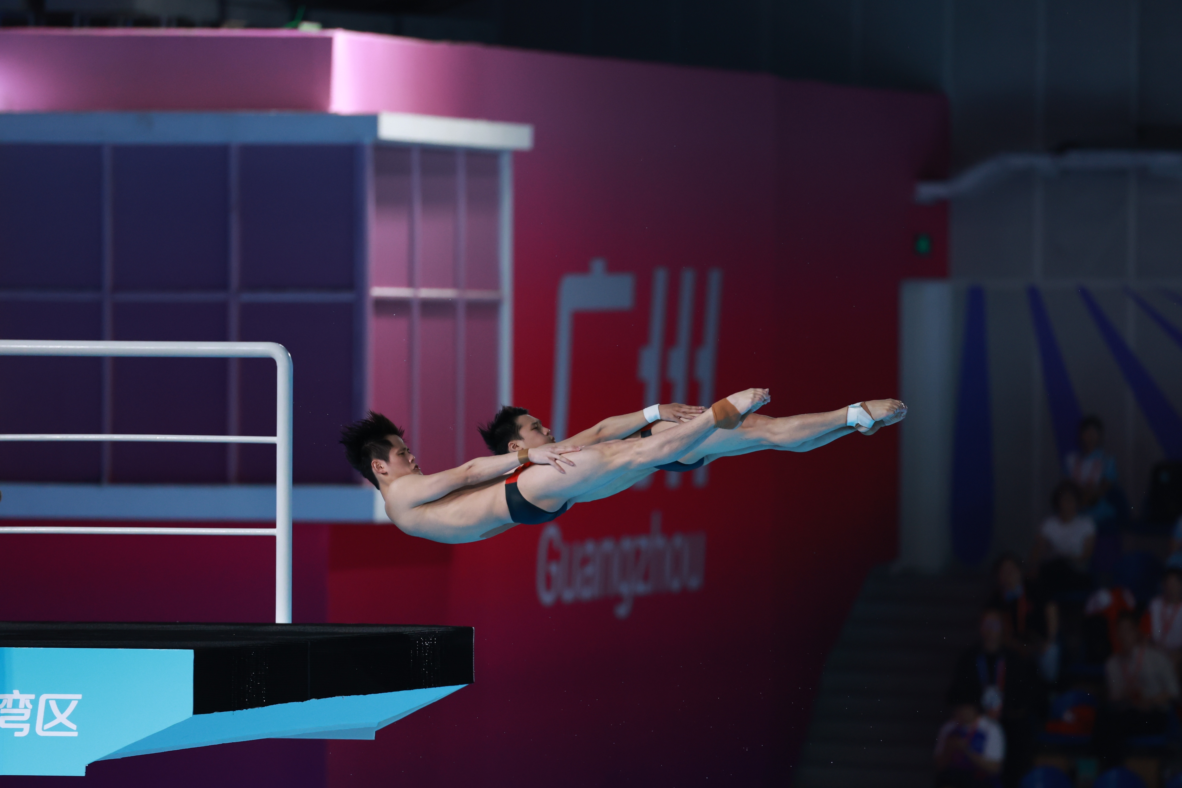 11月7日晚,广东奥体中心泳馆内,十五运会跳水项目男子双人10米跳台决赛战至21时许,广东组合陈艾森/朱子锋斩获银牌。