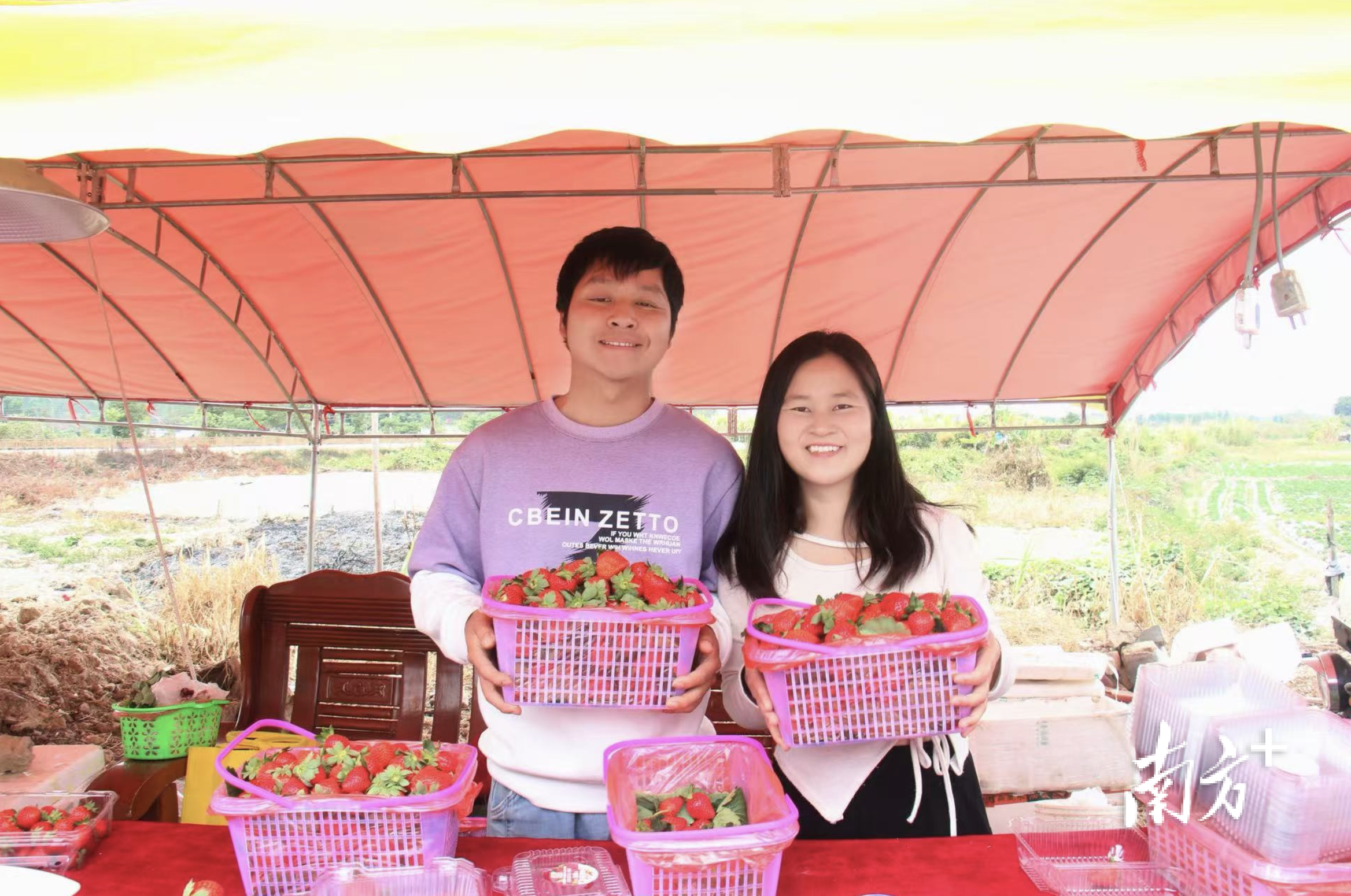 “95后”姐弟陈美菊和陈少杰手捧草莓。