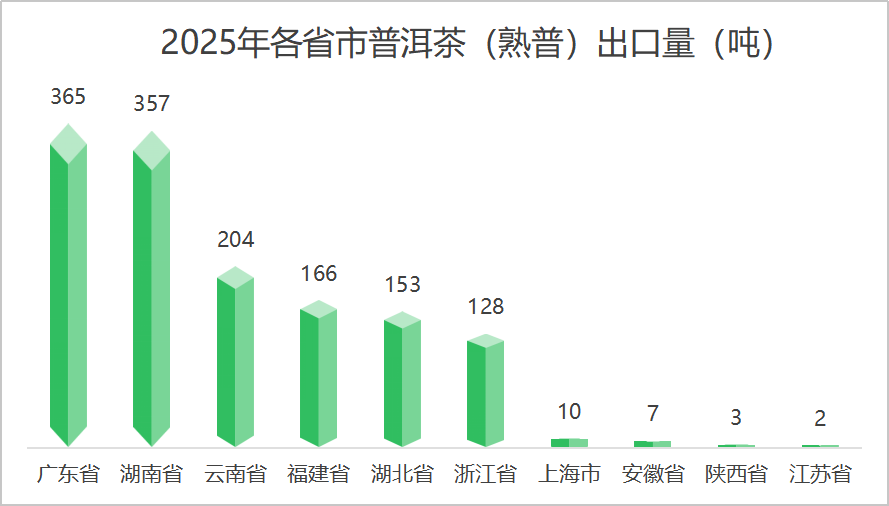 数据显示,2025年广东普洱茶(熟普)出口量365吨、出口额达188万美元,尽管分别同比下降24.5%和27.5%,但仍领先于其他省市区。