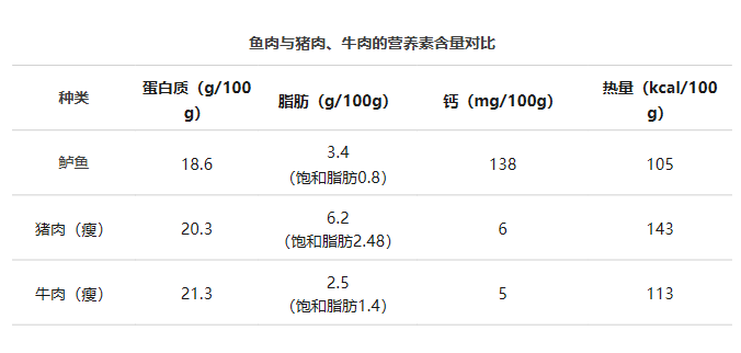 鱼肉作为“白肉”的一种,比起猪牛羊肉来说,热量和饱和脂肪的含量更低,钙等矿物质的含量相对更高,可以作为减重、减脂期的优质蛋白质来源。