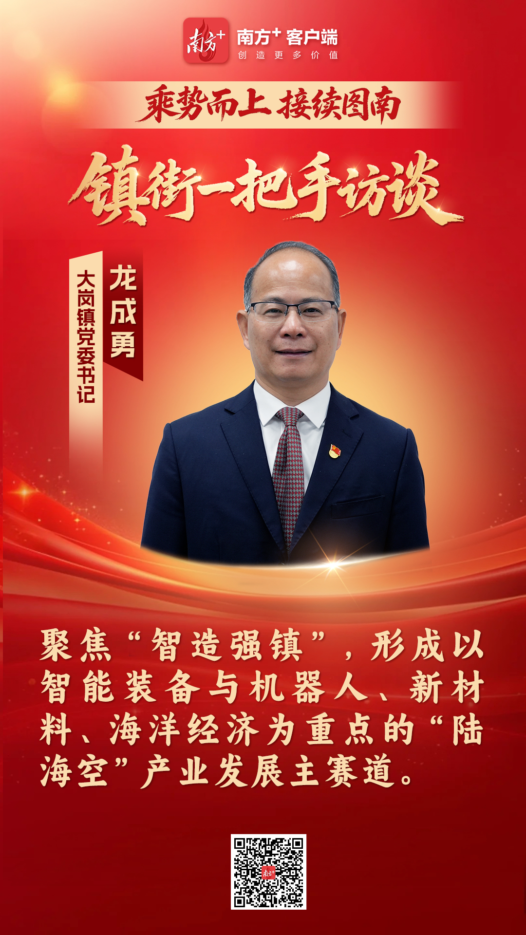 龙成勇:大岗镇聚焦“智造强镇”,充分落实市“12218”产业体系,对接区“8+2+3”产业体系,形成以智能装备与机器人、新材料、海洋经济为重点的“陆海空”产业发展主赛道。