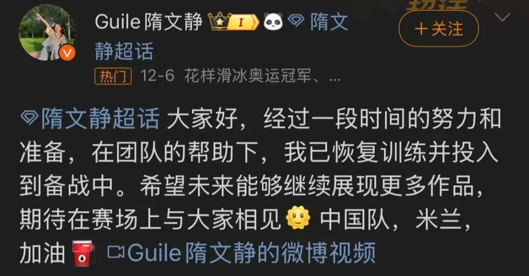 隋文静表示,“经过一段时间的努力和准备,在团队的帮助下,我已恢复训练并投入到备战中。希望未来能够继续展现更多作品,期待在赛场上与大家相见。中国队,米兰,加油。”