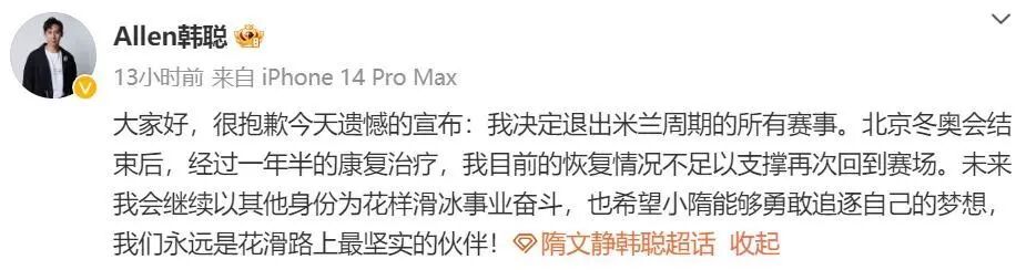 韩聪还在文中称,未来自己会“继续以其他身份为花样滑冰事业奋斗。”