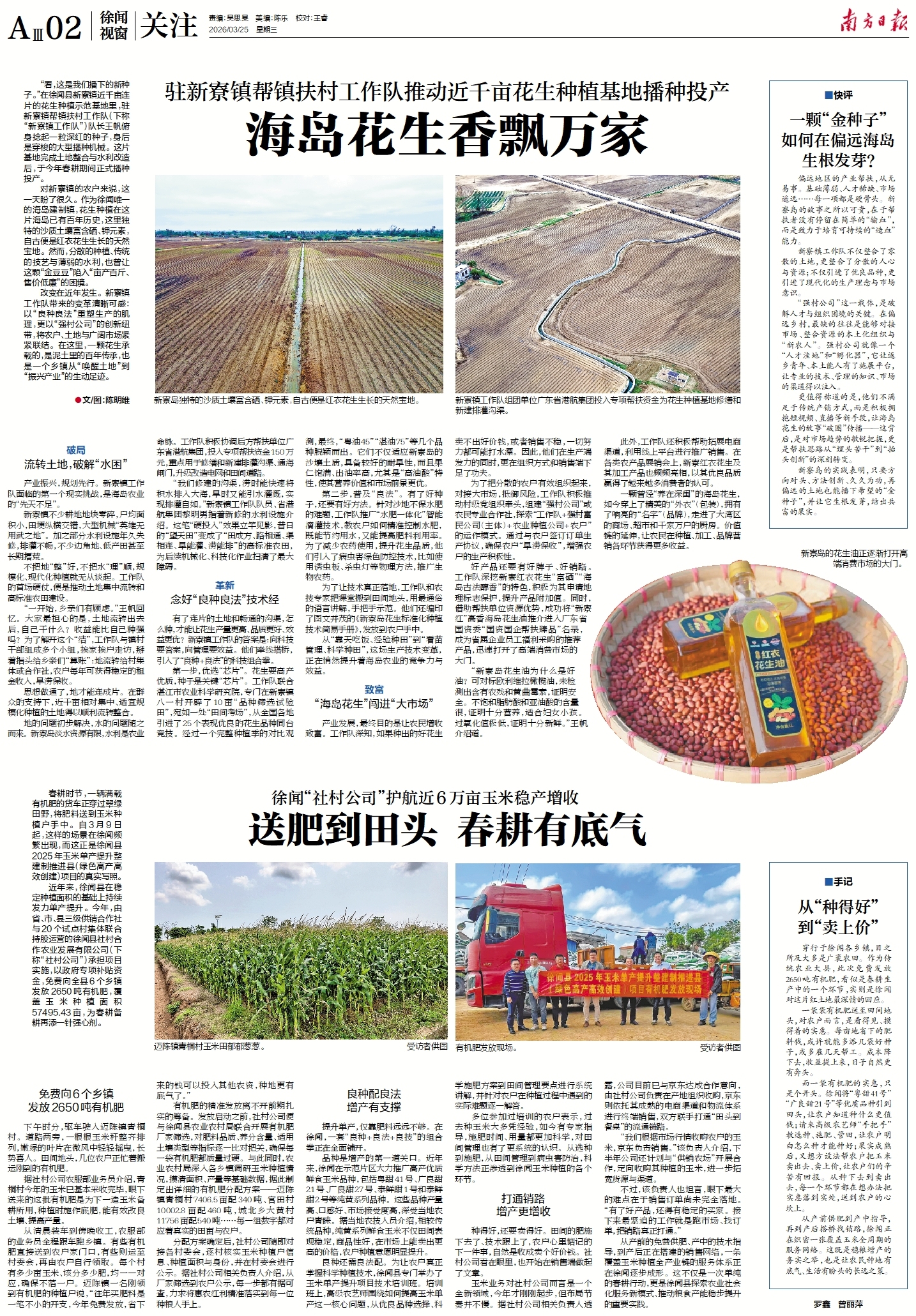 看,这是我们播下的新种子。”在徐闻县新寮镇近千亩连片的花生种植示范基地里,新寮镇驻镇帮镇扶村工作队(下称“新寮镇工作队”)队长王帆俯身捻起一粒深红的种子,身后是穿梭的大型播种机械。这片基地完成土地整合与水利改造后,于今年春耕期间正式播种投产。