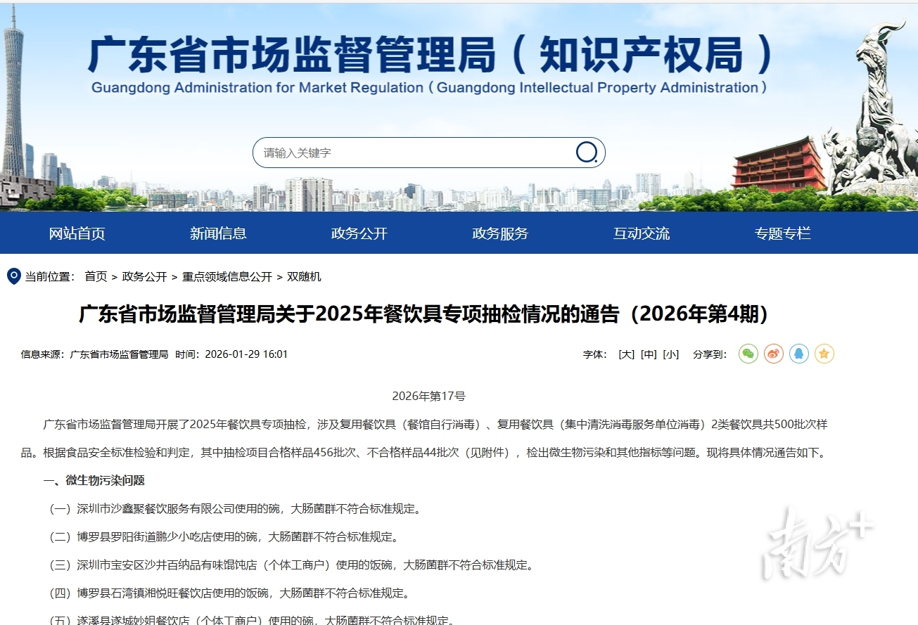 今年1月,广东省市场监督管理局公布的2025年餐饮具专项抽检结果显示,44批次复用餐饮具不合格,大肠菌群、阴离子合成洗涤剂残留问题突出。