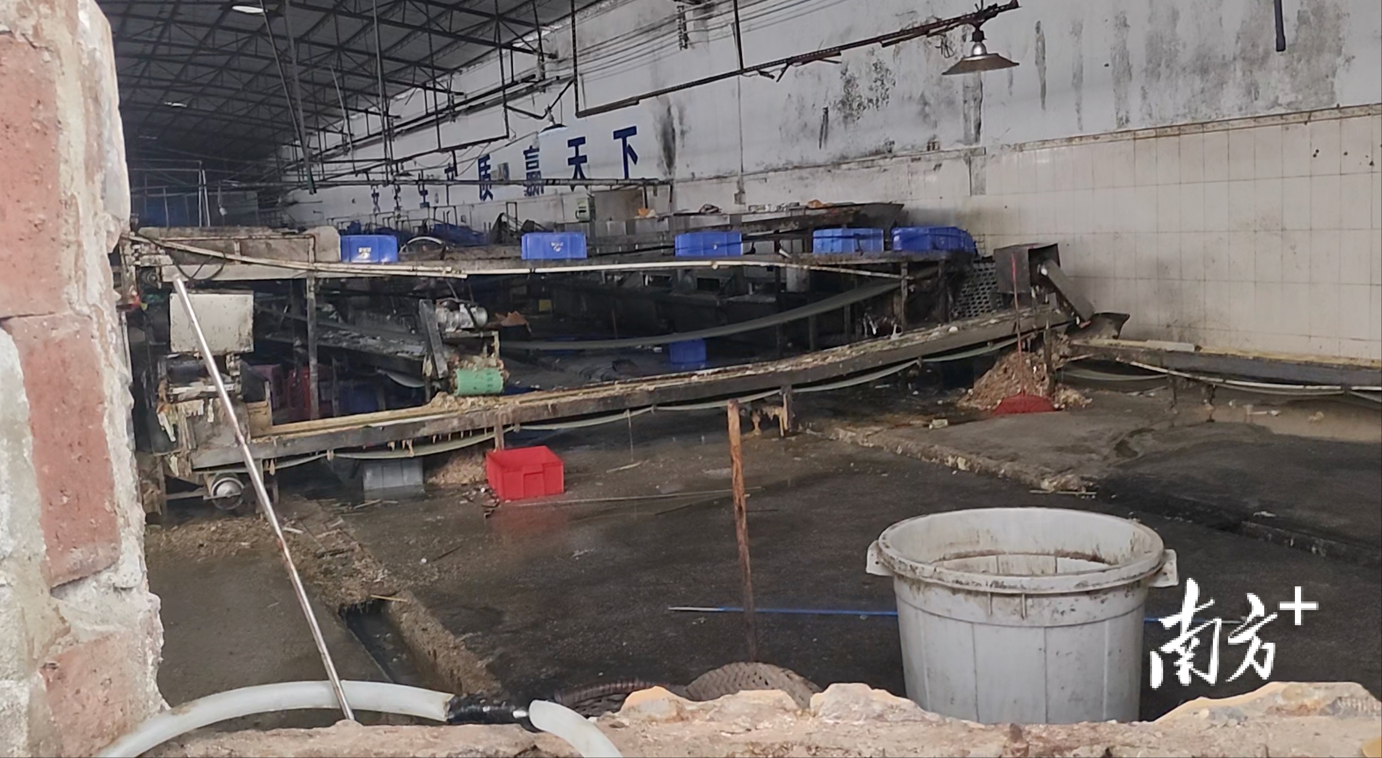 来到厂区门口,记者看到随意摆放的垃圾桶糊满黑色污垢,紧邻车间的地面污水横流,臭味刺鼻。