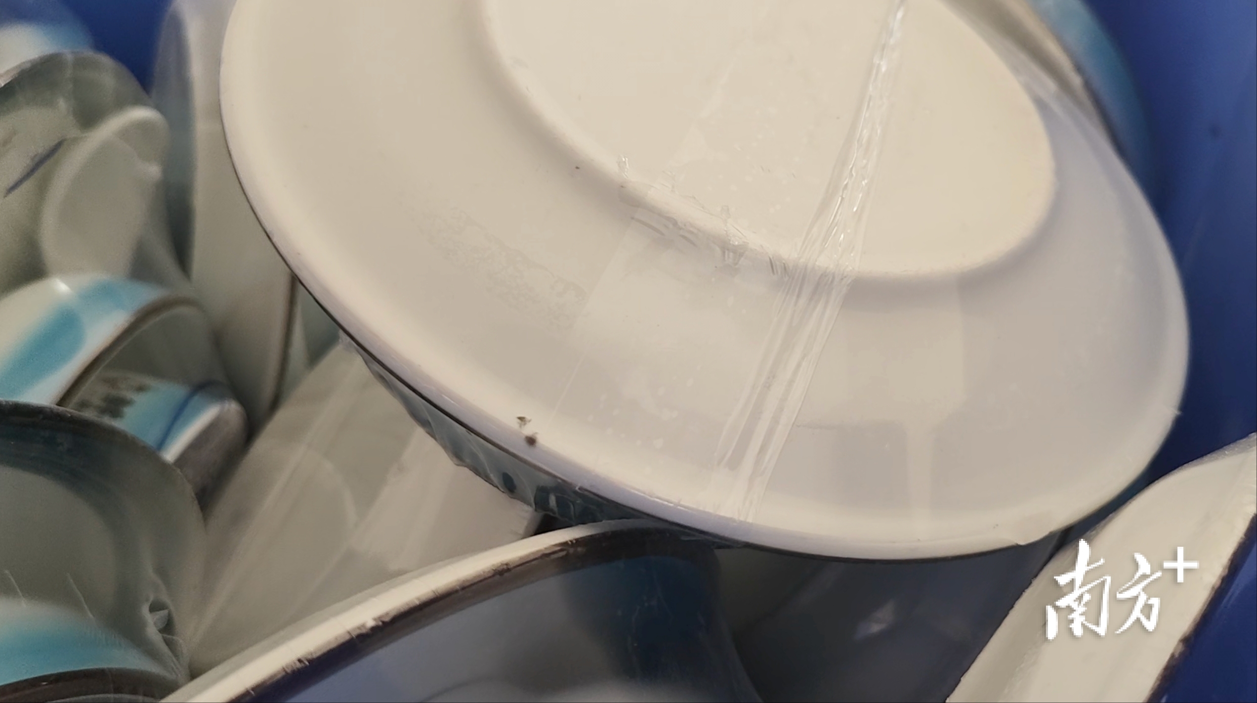 “喷淋的机器坏了,有些喷不到。”一名工人解释道,由于清洗设备的喷淋部件损坏,部分餐具无法做到彻底清洗。