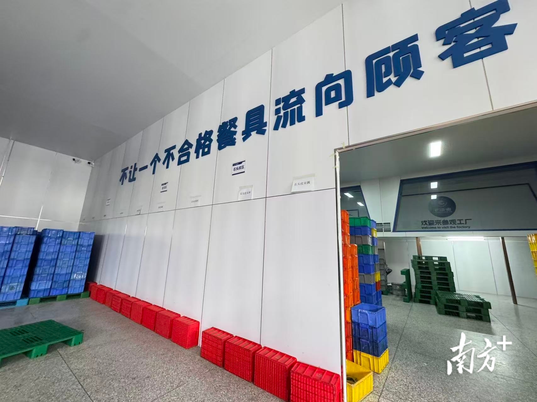 在茂名茂南区乐尔康餐具消毒经营部,这家企业日均清洗消毒两到三万套餐具,其工作人员却表示,“你在家里自己洗,每个碗都会很认真洗,机器不会这么认真洗。”记者走访时正值企业午休,大量清洗完毕等待封膜的碗筷,直接裸露在生产设备上,无人看管,存在极大的二次污染风险。