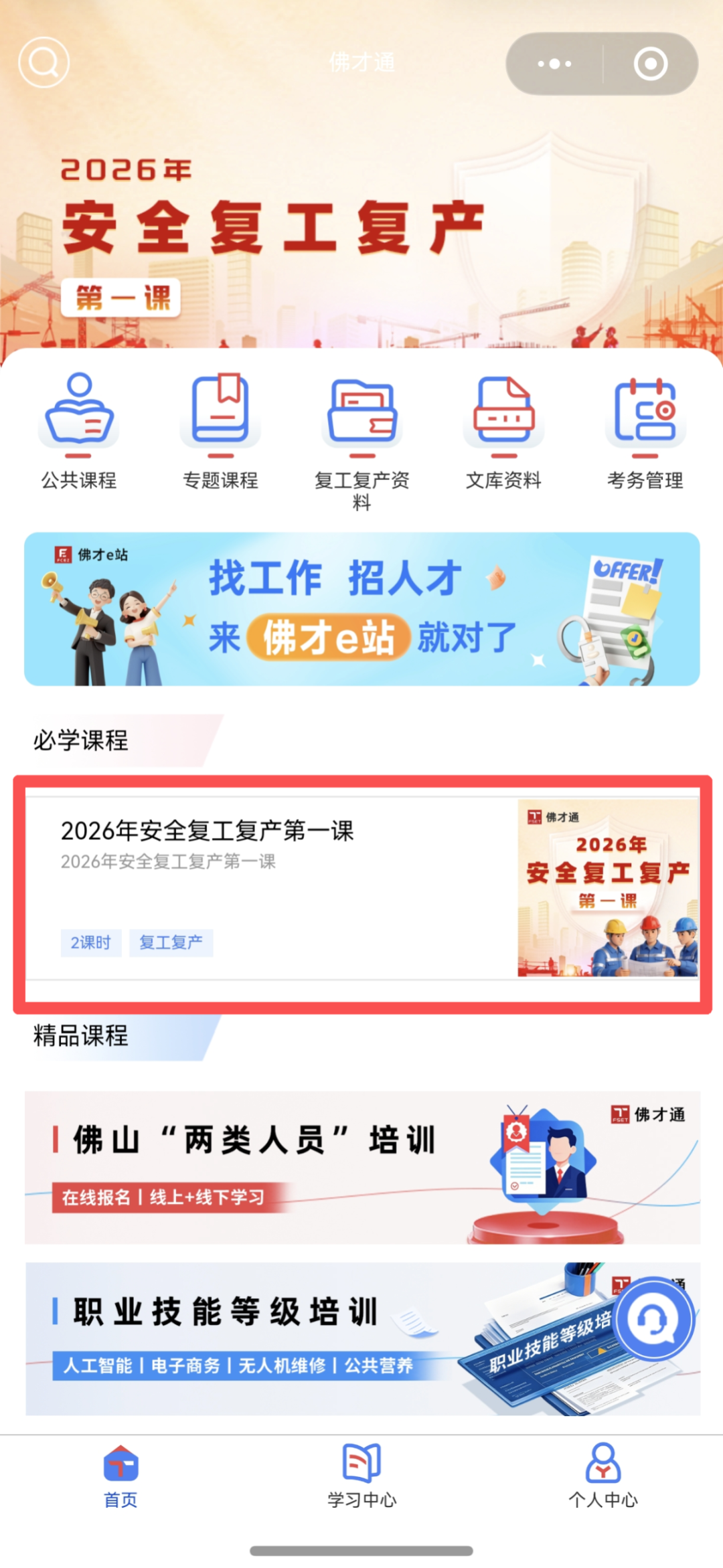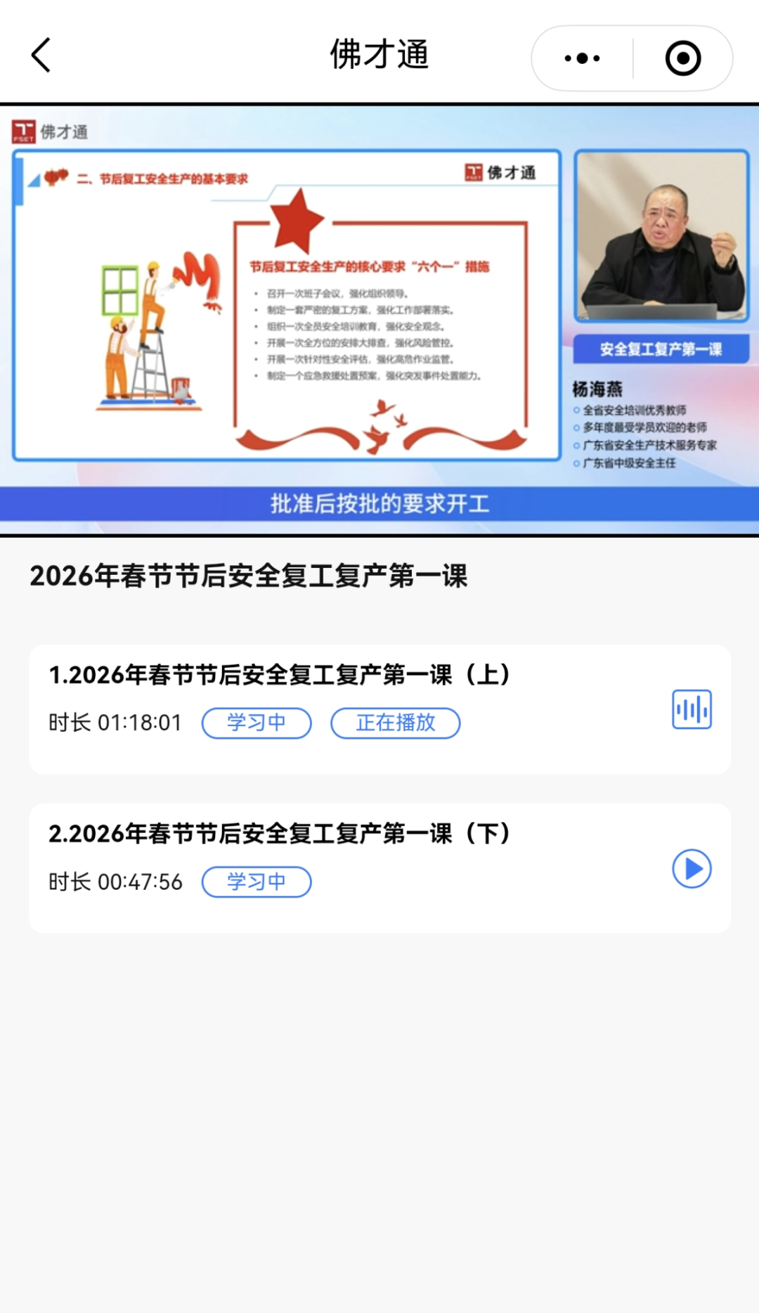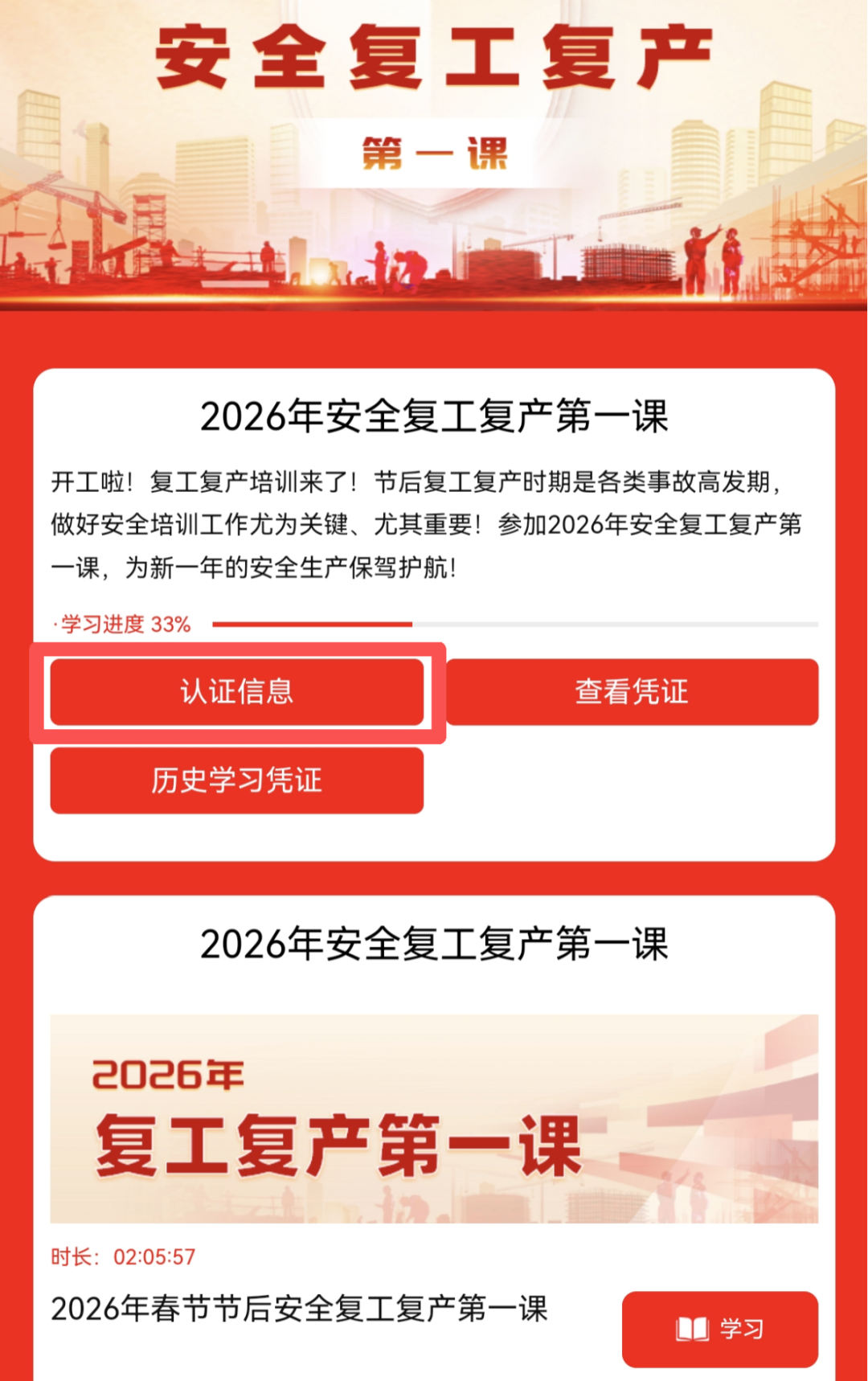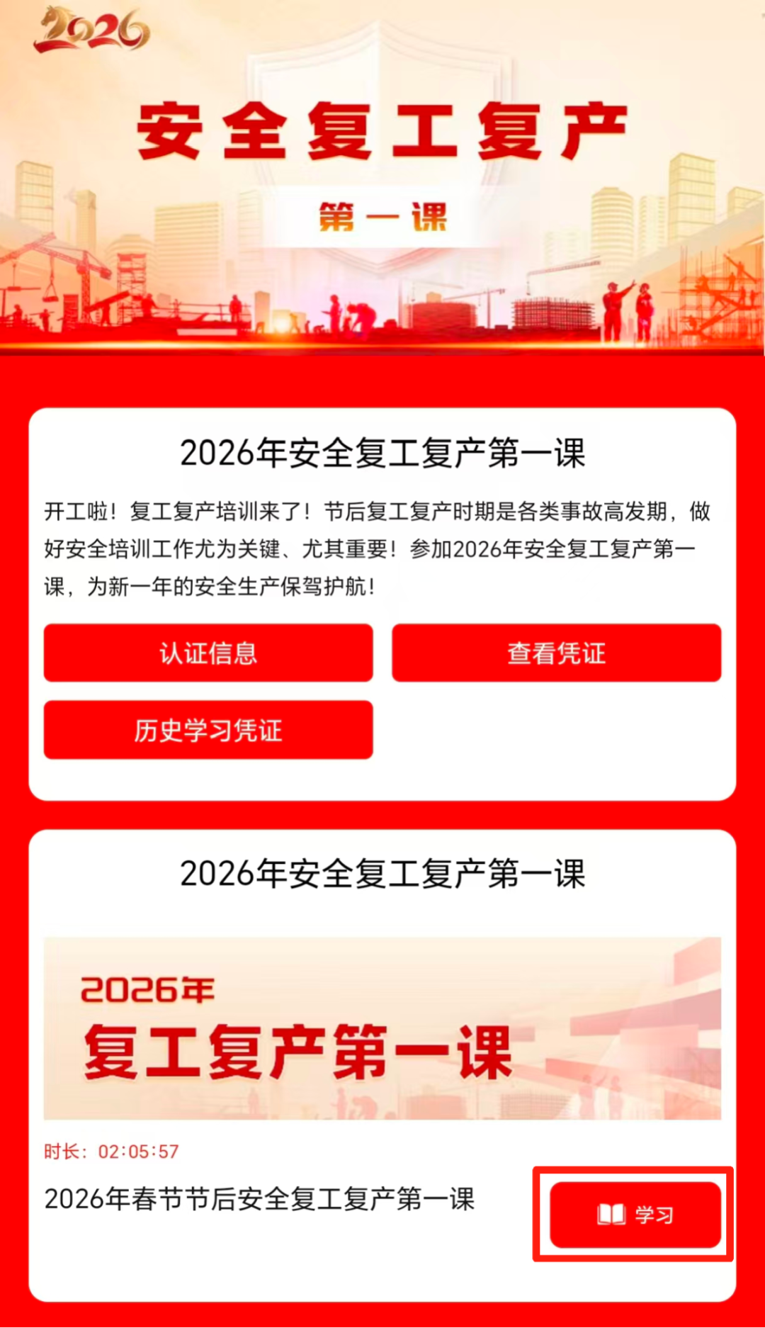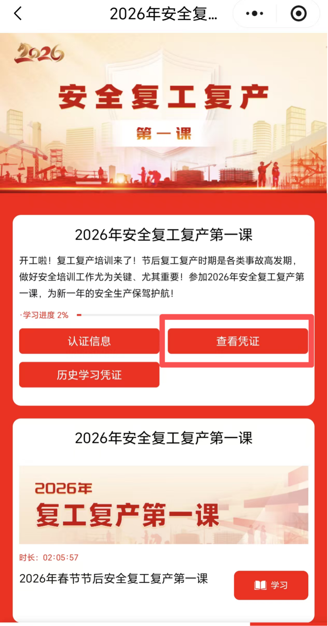 在小程序点击【2026年安全复工复产第一课】,进入课程学习页面。