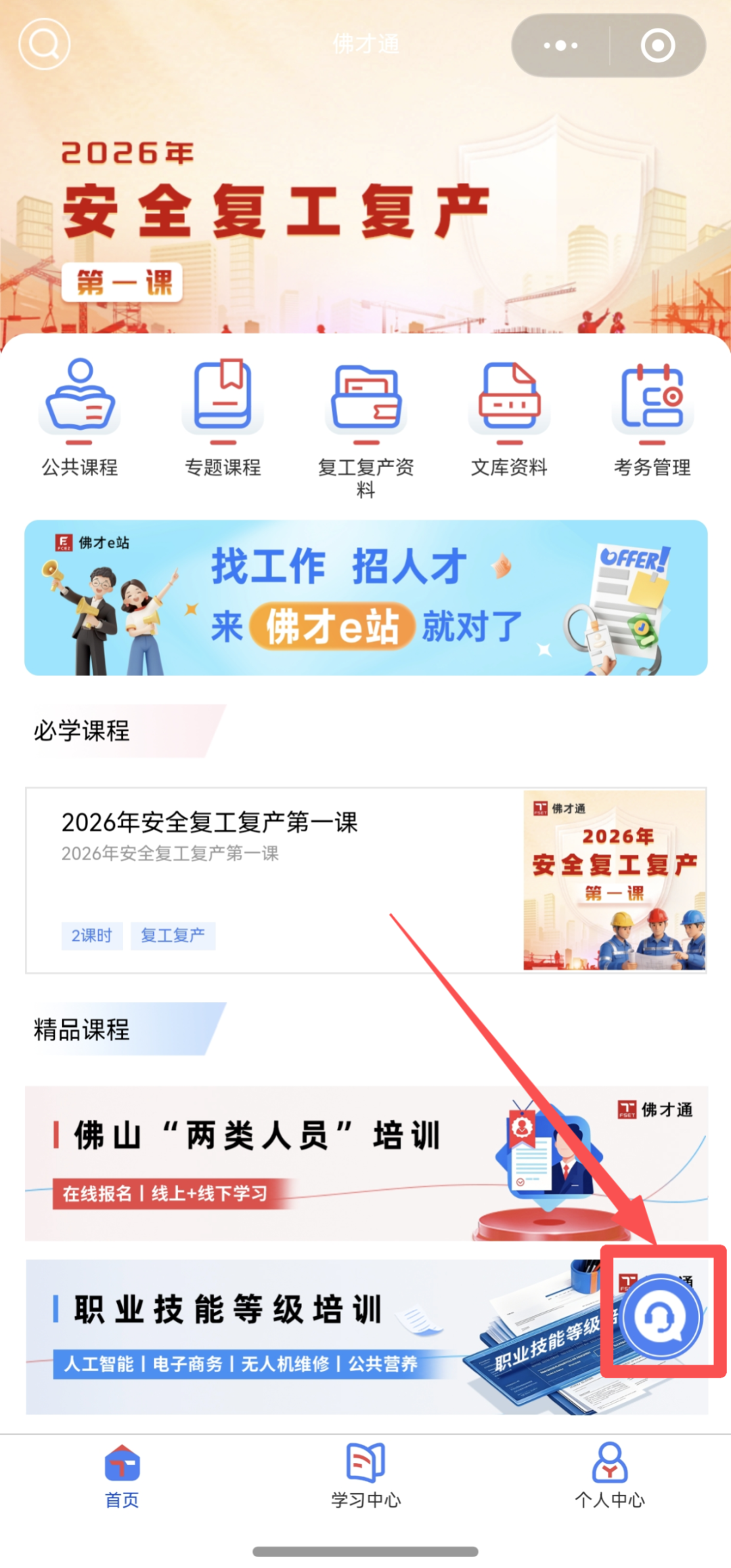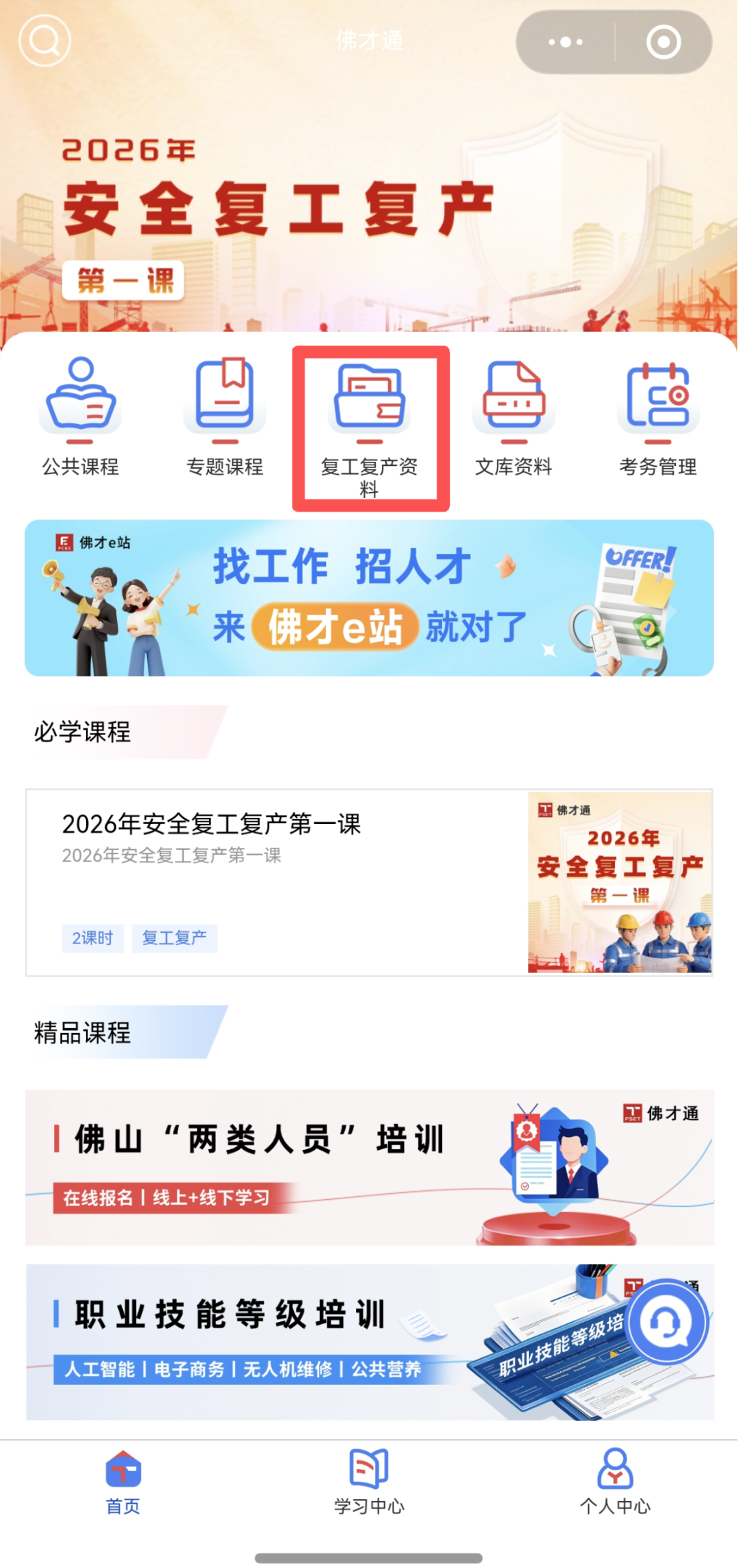 进入【佛才通】小程序首页,点击首页中间【复工复产资料】按键。