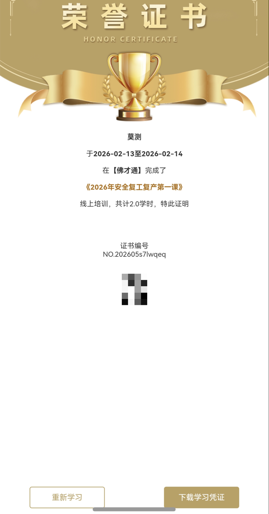 注意:学习过程中不可拖动进度条播放,不能倍速播放,可支持断点续播,中途退出学习后可重新登录继续学习。完成后将自动生成电子凭证。