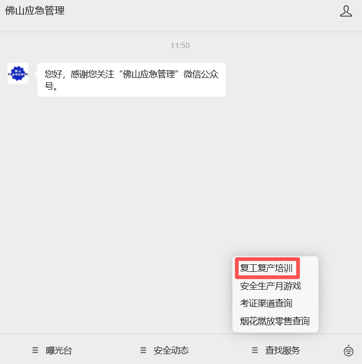 关注“佛山应急管理”微信公众号,点击菜单栏【查找服务】-【复工复产培训】,进入培训小程序。