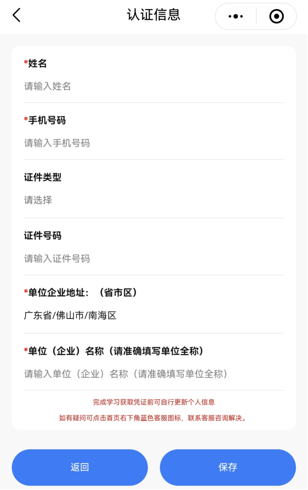 进入课程学习前,需先填写学员信息,在完成学习获取凭证前可自行更新个人信息,如有疑问可点击小程序首页右下角蓝色客服图标,联系客服咨询解决。