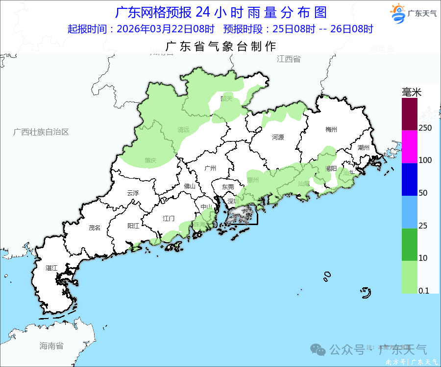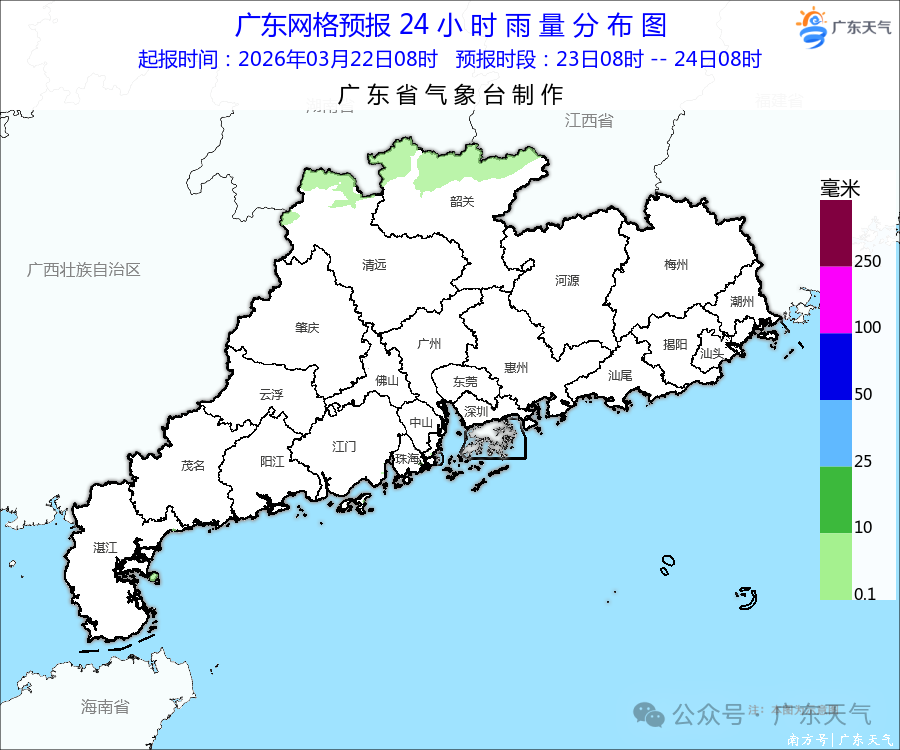 预计22-25日,韶关及清远多阴雨天气,其余大部市县可见阳光,其中珠江三角洲中西部和粤西市县云量较多,有分散性零星小雨。另外,早晚有轻雾或雾,雨雾天气能见度低、道路湿滑,注意交通安全。