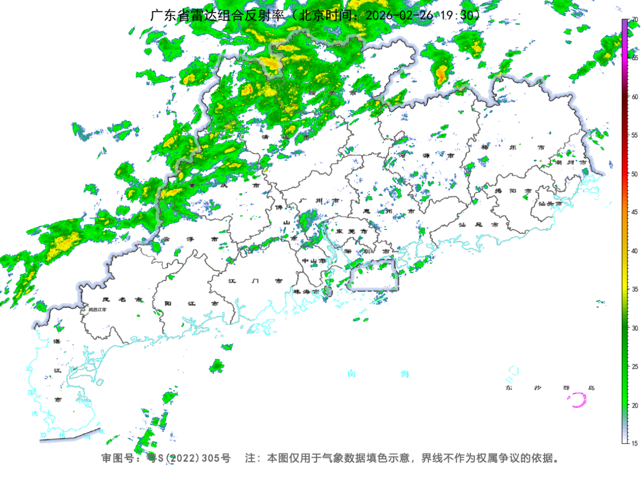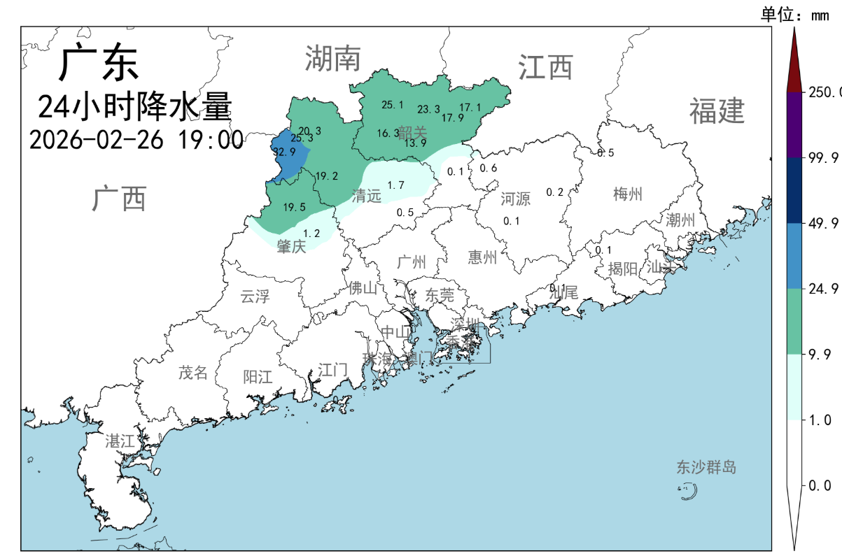 此次降雨区域自北向南移动。截至26日19时30分,从天气雷达回波图看,雨主要下在肇庆北部、清远、韶关市县。据气象水文监测,韶关仁化县长江镇、清远连南瑶族自治县寨岗镇雨量较大。
