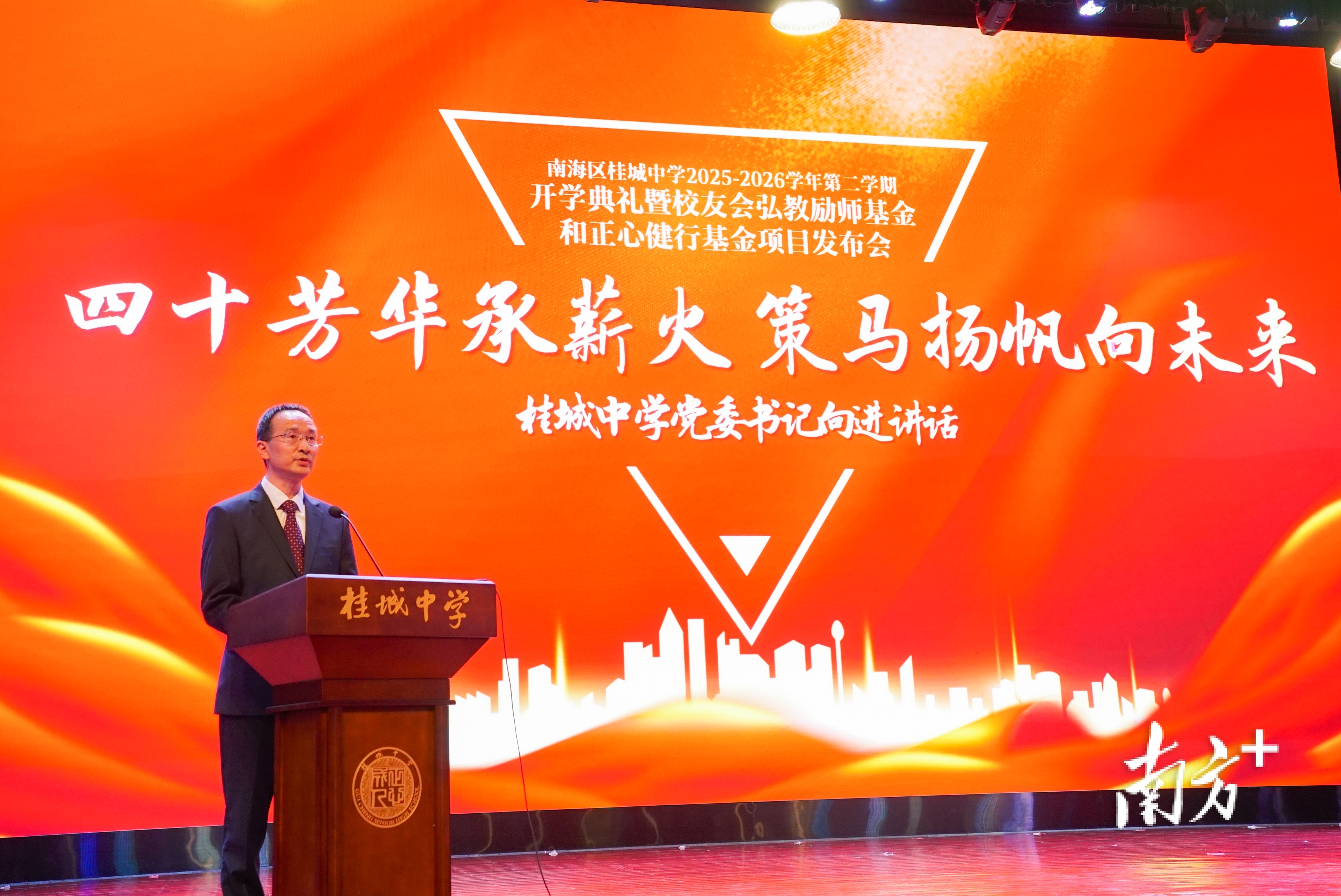 今年是丙午马年,更是桂城中学建校40周年的里程碑之年。在开学典礼上,由学校校友会荣誉会长叶永楷发起设立的“弘教励师基金”、校友会会长何俊文倡议成立的“正心健行基金”正式启动。桂城中学党委书记向进代表学校向两位校友致以崇高敬意。