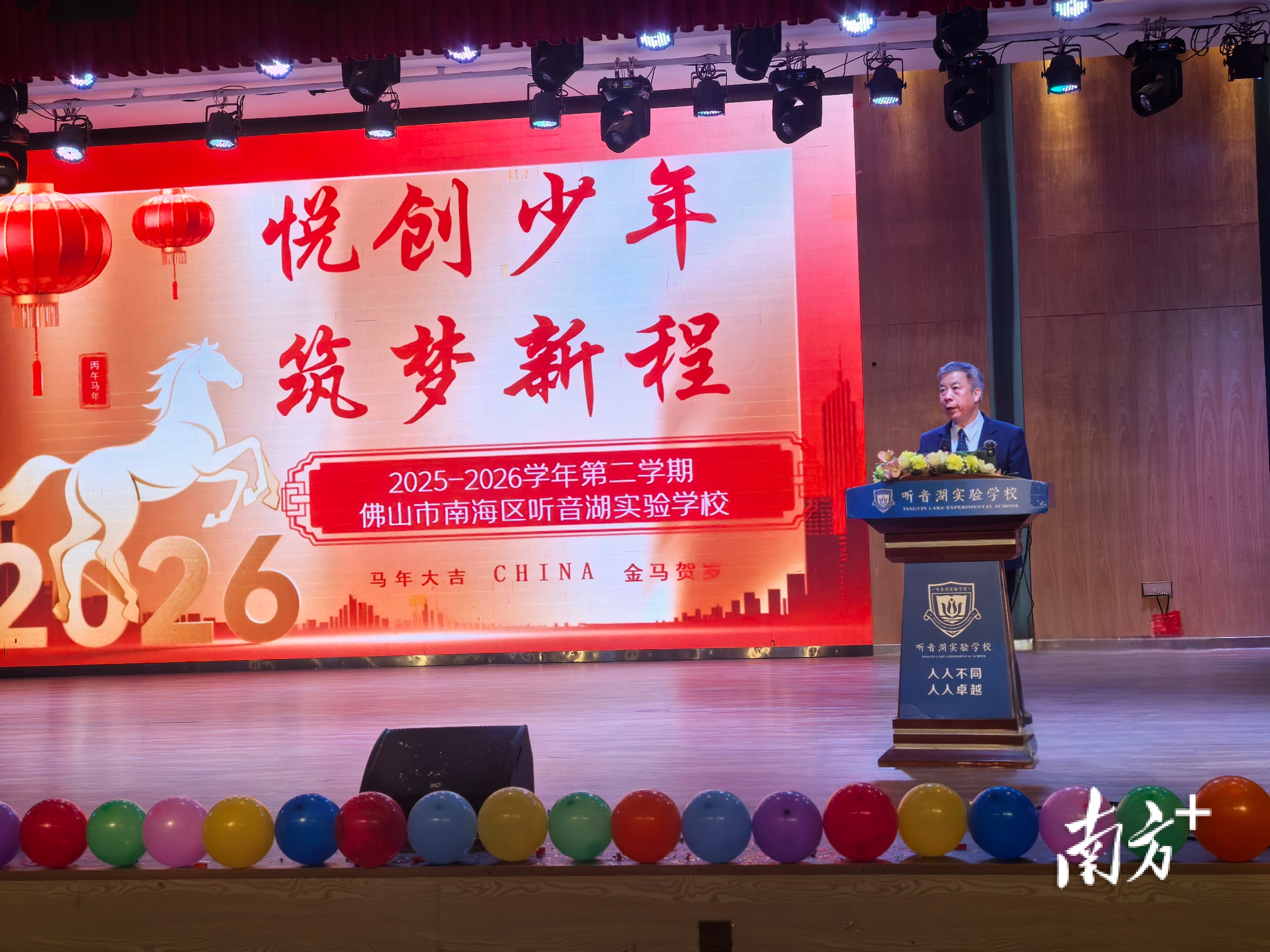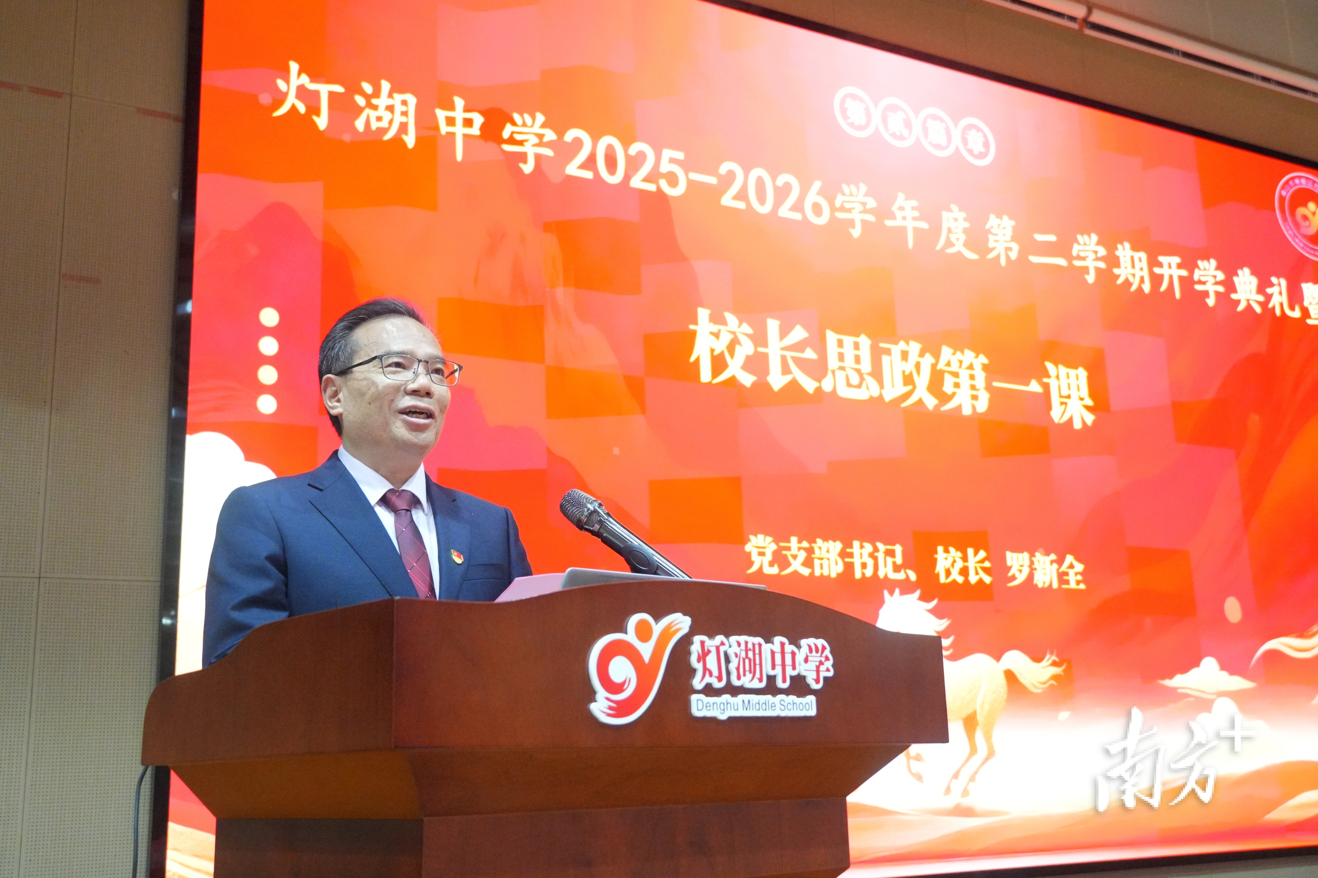 在2026年春季学期开学典礼上,南海实验学校教育集团总校长、南海实验学校党委书记杨剑以“策马扬鞭向未来”为主题,向全体师生发表新学期寄语。正值农历马年,他形象地送给同学们三匹“追风马”。