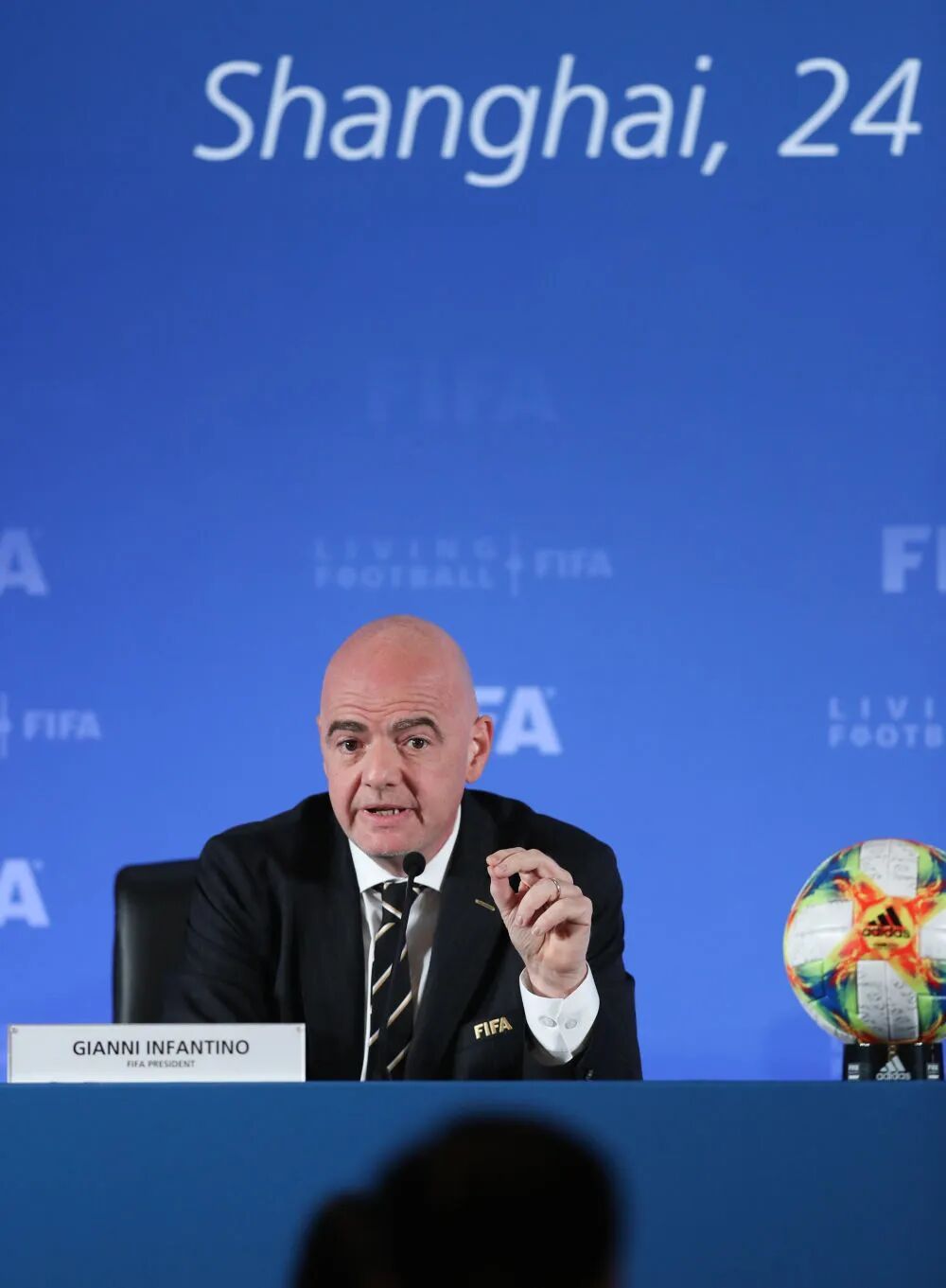 △ 资料图:2019年10月24日,国际足联主席因凡蒂诺在上海举行的国际足联理事会新闻发布会上讲话。新华社记者 丁汀 摄