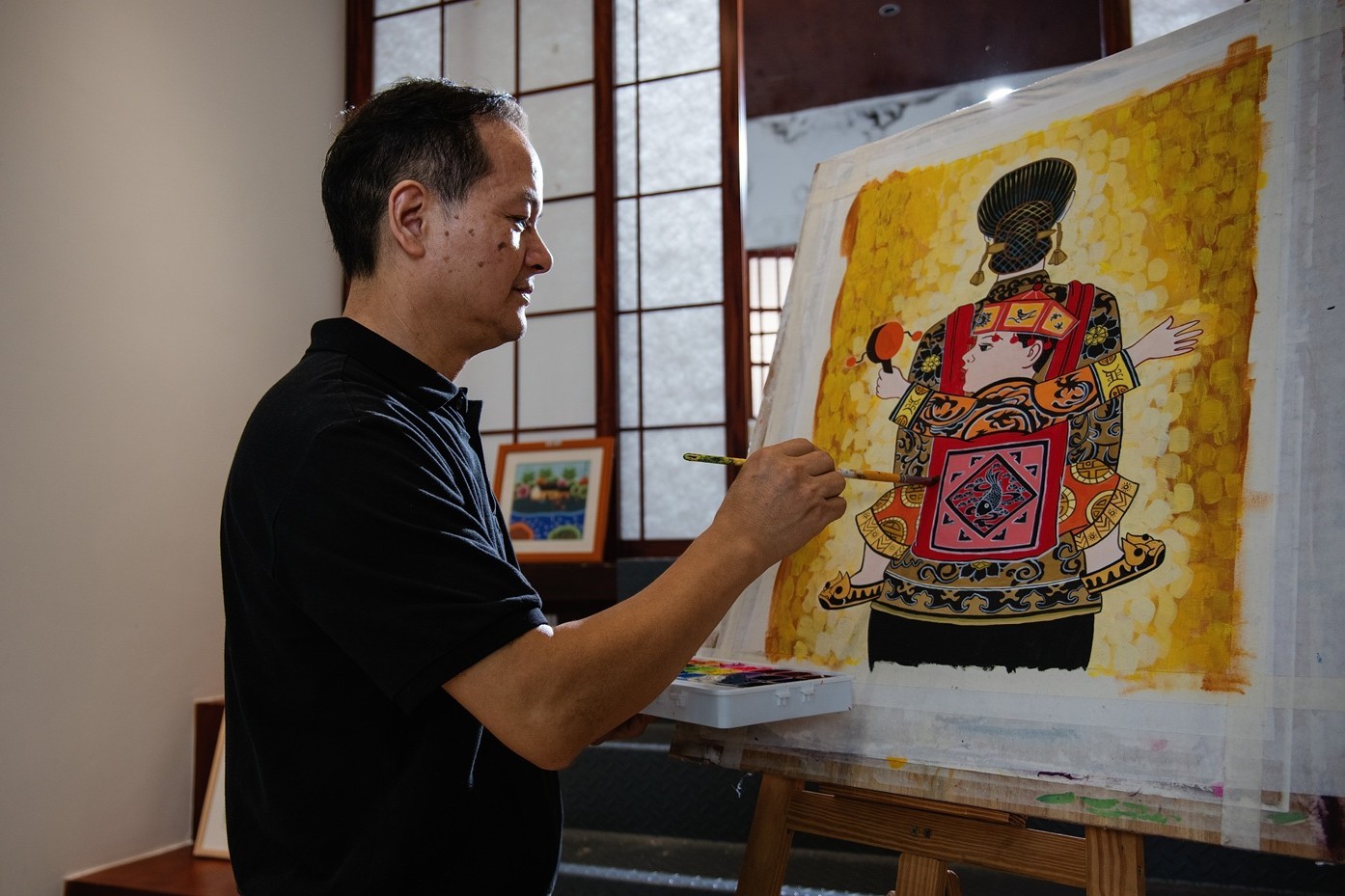 黄伟平正在创作以“母亲”为主题的龙门农民画。(彭华 摄)