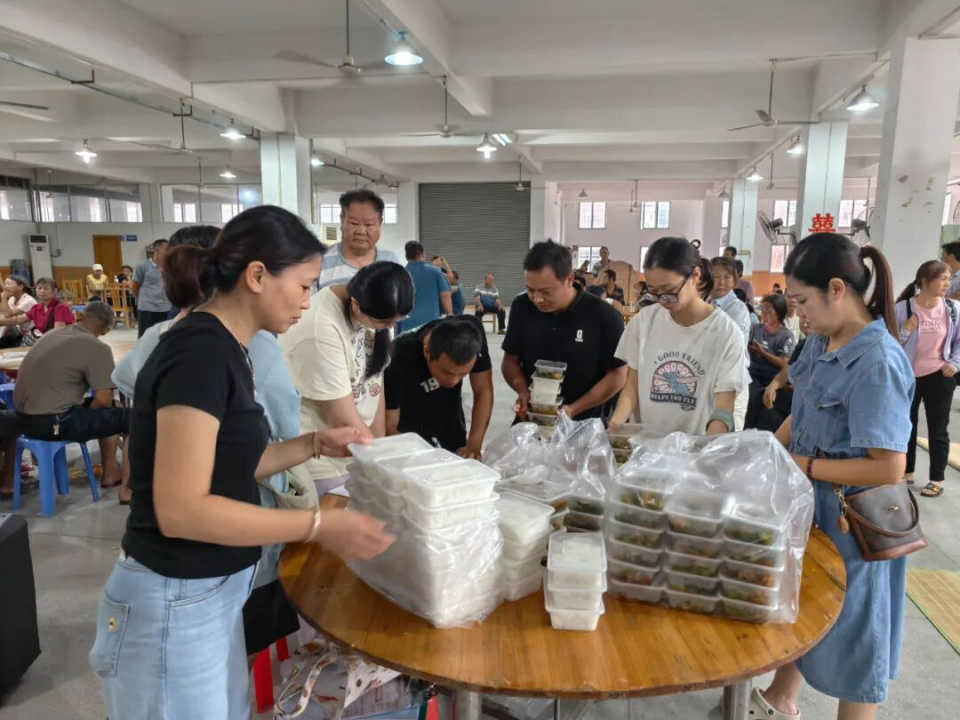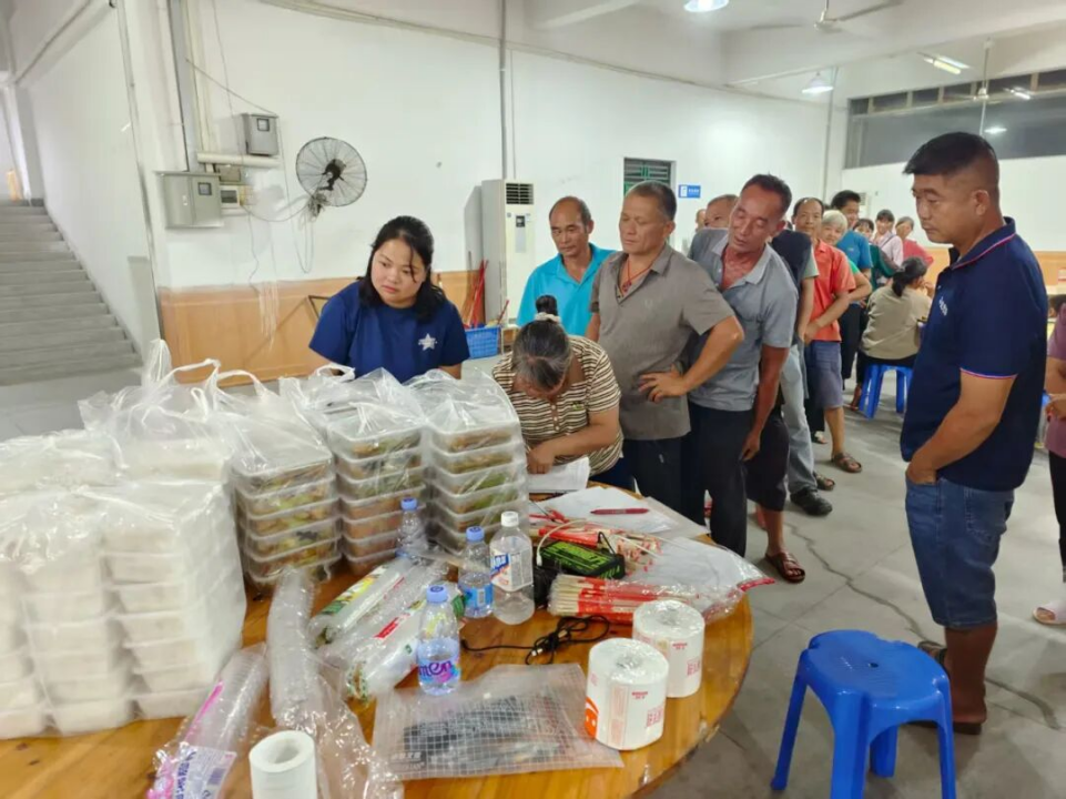 风声雨声中,桥头镇迳联社区安置点飘出阵阵饭香。9月24日中午十二点,两百多份热气腾腾的午餐被准时送达。打开饭盒,辣椒炒鸡、豉油鹅、牛肉榨菜等饭菜的香味,弥漫在这一1200平方米的安置点中。在这里暂避台风的群众有序排起队伍,热乎的饭盒依次传递。