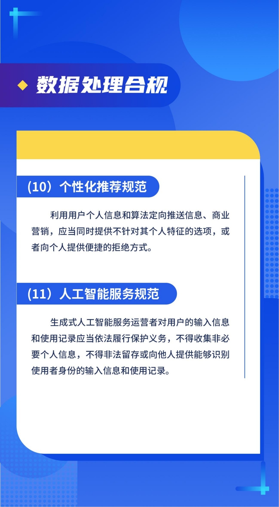 (十一)人工智能服务规范。生成式人工智能服务运营者对用户的输入信息和使用记录应当依法履行保护义务,不得收集非必要个人信息,不得非法留存或向他人提供能够识别使用者身份的输入信息和使用记录。