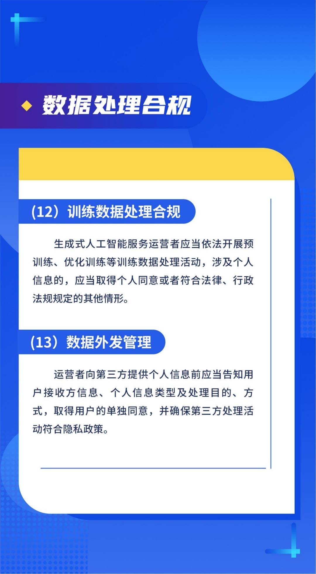 (十二)训练数据处理合规。生成式人工智能服务运营者应当依法开展预训练、优化训练等训练数据处理活动,涉及个人信息的,应当取得个人同意或者符合法律、行政法规规定的其他情形。