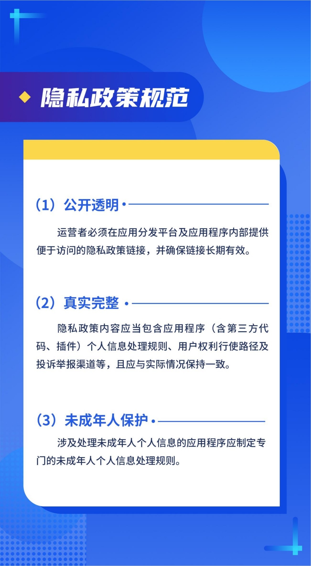 在隐私政策规范方面,《指引》要求,应用分发平台及App内须提供便于访问、长期有效的隐私政策,应包含个人信息处理规则、用户权利行使和投诉渠道;涉及未成年人个人信息的,还要单列规则。