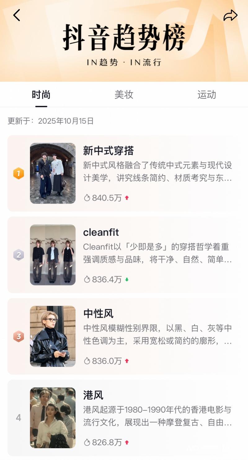 “抖音趋势榜”页面截图该榜单基于平台近7日的播放、互动、搜索及电商数据生成,从春夏季的欧若风、恋夏风,到秋冬季的琥珀系,这些流行于互联网的时尚穿搭风格,会在趋势榜得到呈现。