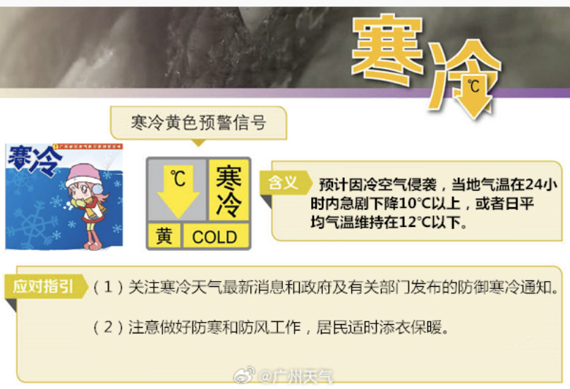 广州应急部门、气象部门提醒,13-14日天气明显转冷,易诱发心血管、呼吸道等疾病,正值流感高发季节,请相关部门做好疾病预防、人员救助等相关工作。