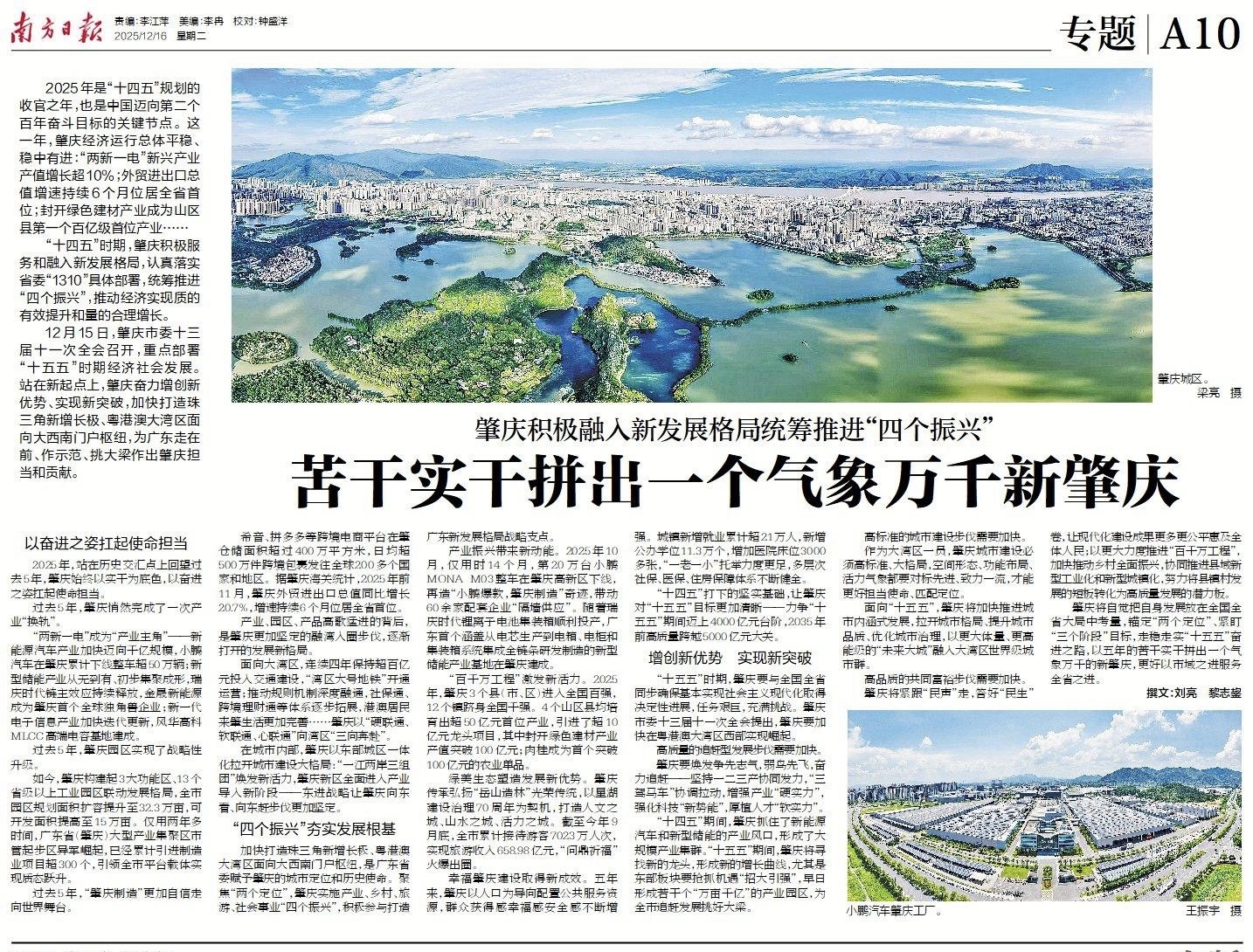 12月15日,肇庆市委十三届十一次全会召开,重点部署“十五五”时期经济社会发展。站在新起点上,肇庆奋力增创新优势、实现新突破,加快打造珠三角新增长极、粤港澳大湾区面向大西南门户枢纽,为广东走在前、作示范、挑大梁作出肇庆担当和贡献。