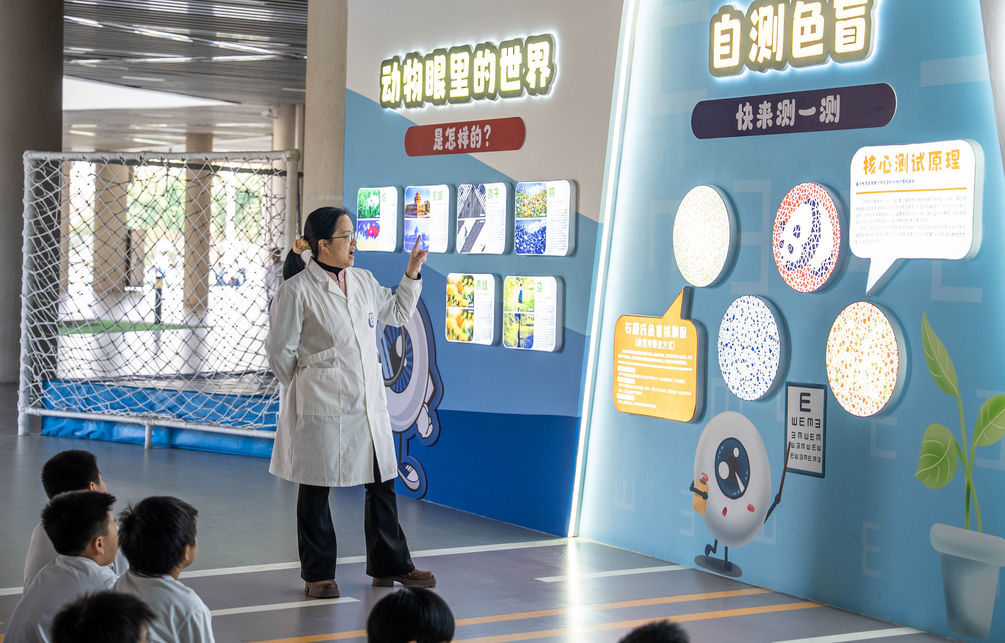学生们可以通过了解蛇、蜜蜂、马等动物的视觉特性,学习红外感知、全景视野等知识;通过假同色图辨识潜在色觉异常;通过模拟症状图初步了解斜视、弱视;还能在“问答翻转”板块中即问即学,巩固护眼常识。