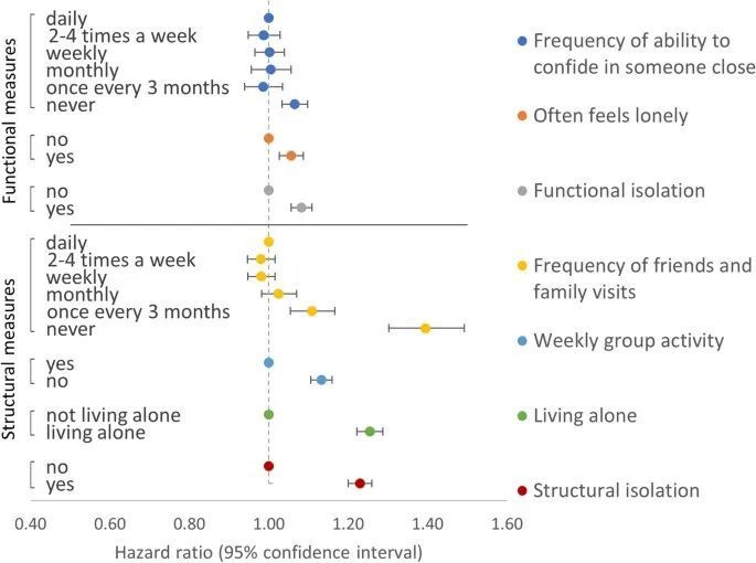 这提示我们社会孤立的影响存在叠加效应,单纯参加集体活动或偶尔倾诉,难以抵消长期独居带来的健康风险,识别高风险人群需同时关注心理感受和实际社交状态。