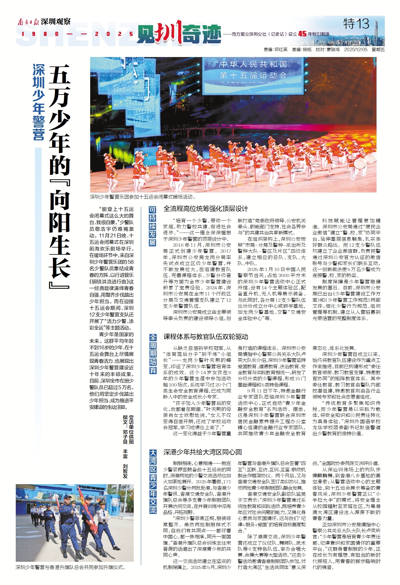 青少年是国家的未来。这群平均年龄不到16岁的少年,在十五运会舞台上尽情展现青春活力,也展现出深圳少年警营建设近十年来的丰硕成果。目前,深圳全市在册少警队员已超过5万名。他们用坚定步伐踏出少年担当,成为推进平安建设的生动注脚。