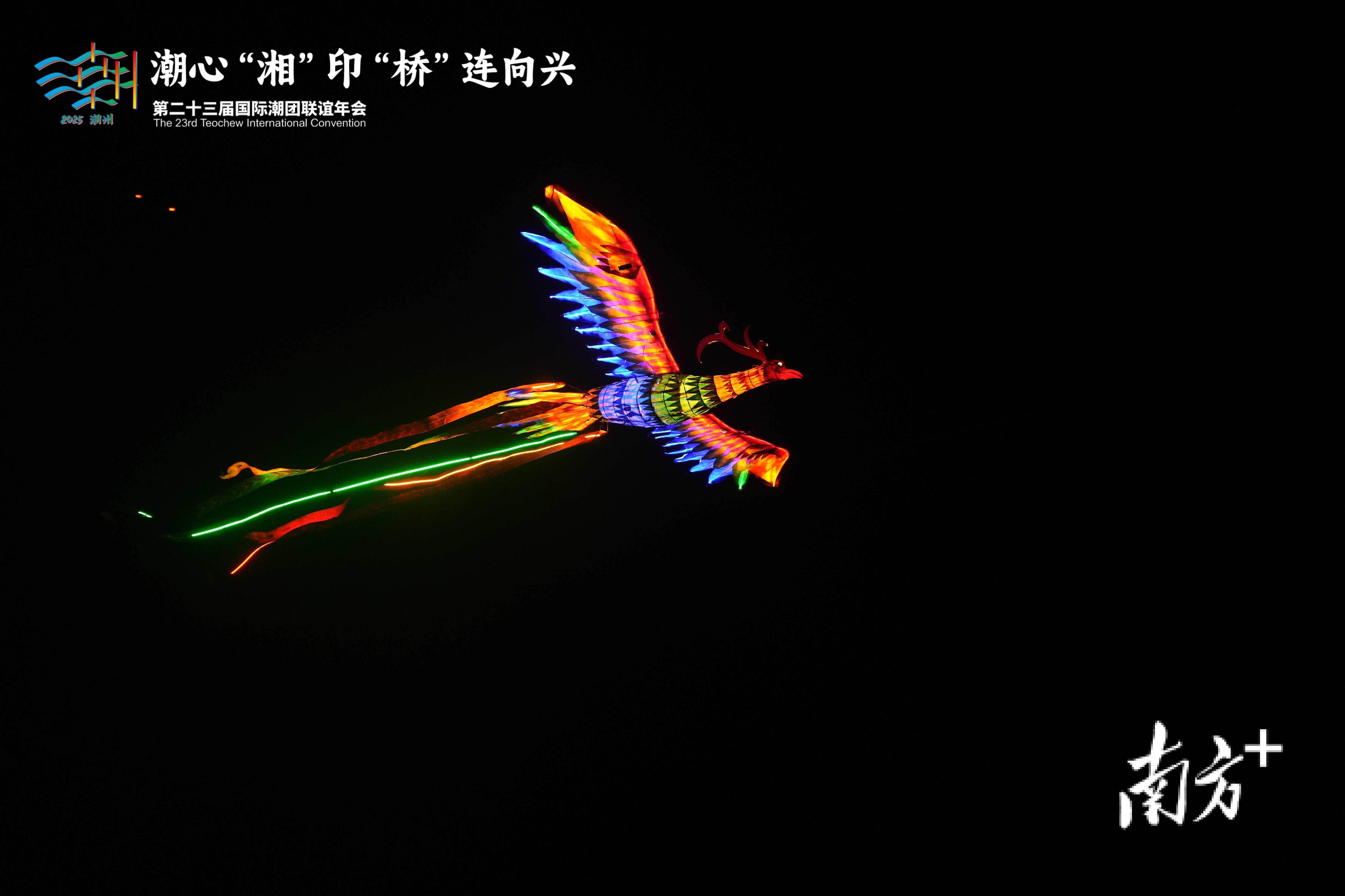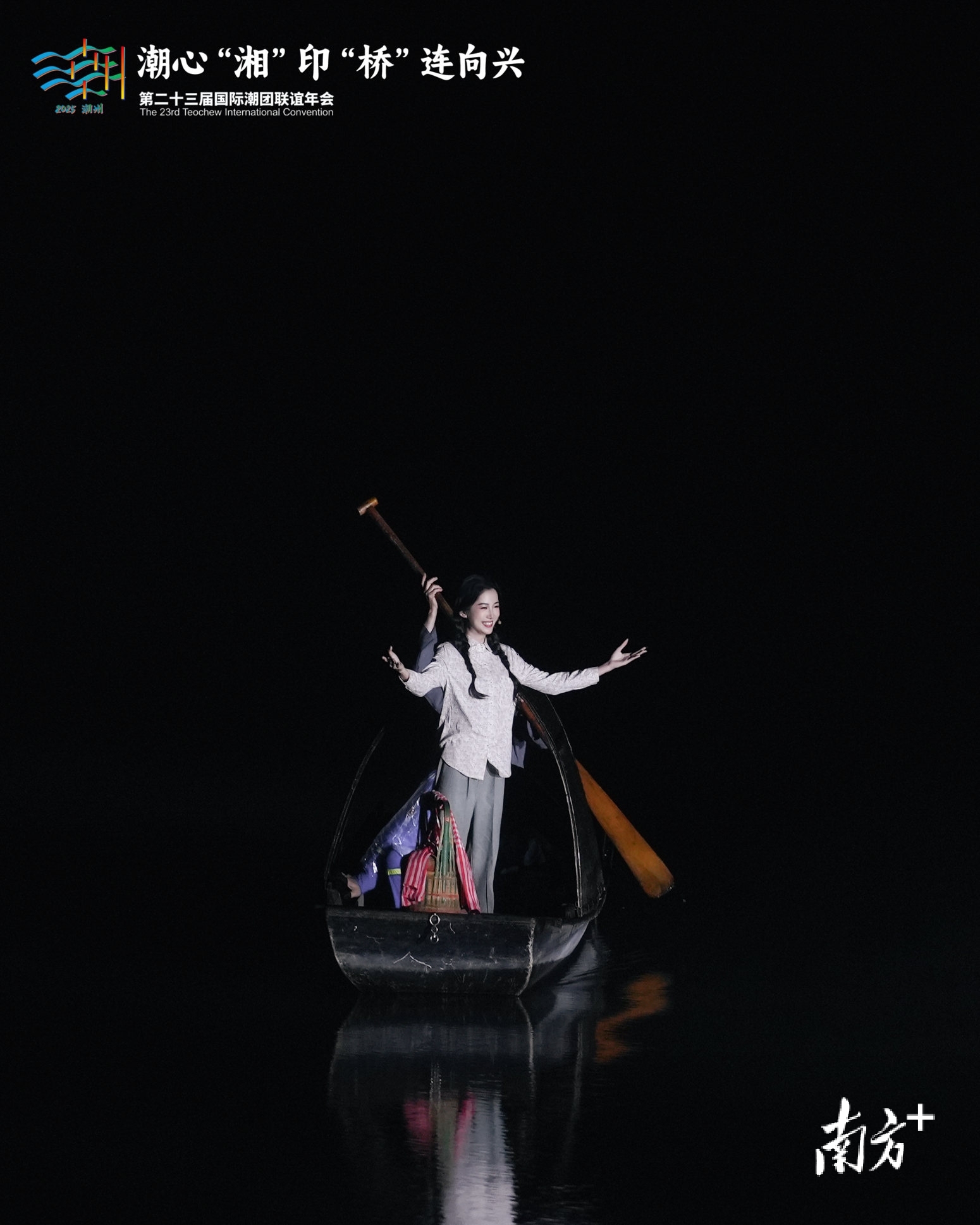 一声凤鸣划破安静的夜空,一只彩凤从远方飞来,沈嘉阳扮演姑姑提着市篮、甜粿,唱着《潮州人》乘着小舟随彩凤朝回家的方向缓缓驶来;侄儿侄女们在岸边盼迎,拉着她去逛家乡节日的闹市、吃“庞沛”、看戏……