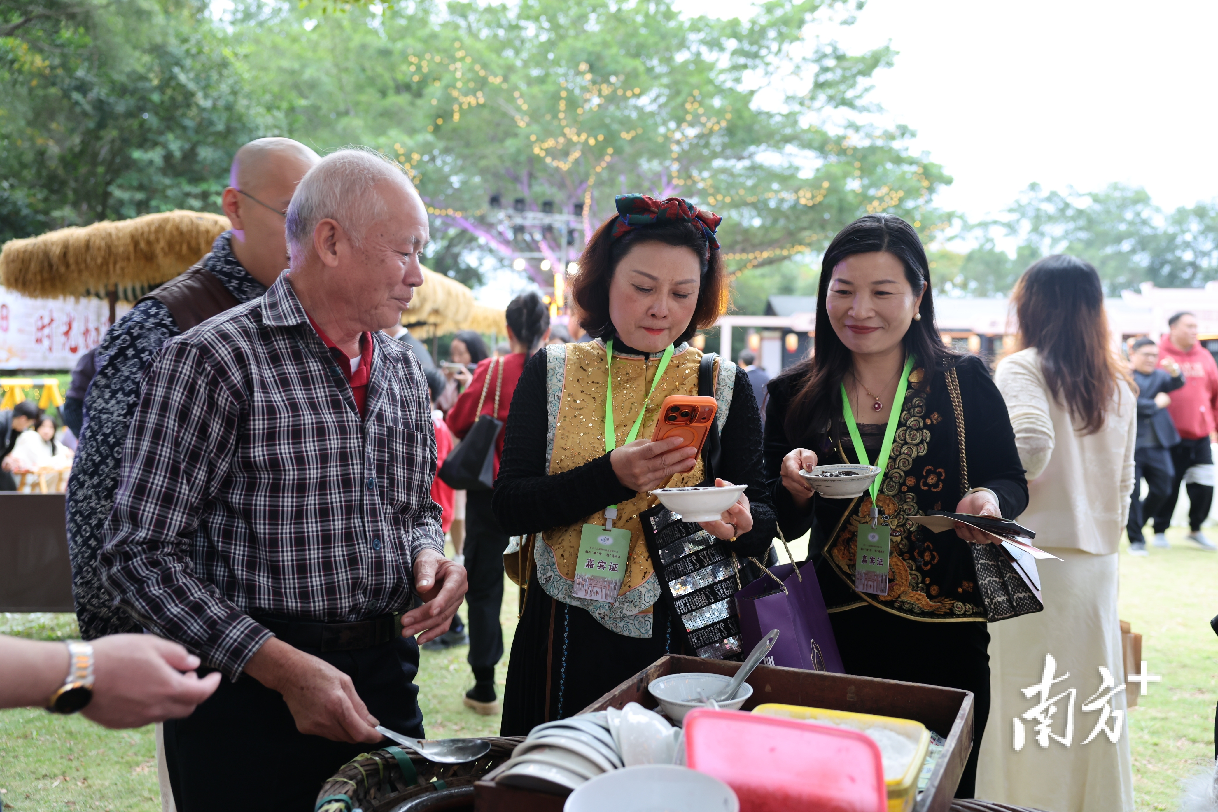 最引人驻足的,是在草粿摊前,只见摊主手持“鸡公碗”与铁勺,有节奏地敲击出“咣咣铛铛”的声响,食客接过“鸡公碗”,舀一勺黑亮滑嫩的草粿,撒上一层白糖,蹲在旧式单车边慢慢啜饮。看着手里的“鸡公碗”,不少老华侨眼眶发热,泰国潮州会馆总干事吴学聪动情地说:“几十年没见人用‘鸡公碗’卖草粿了,今天像回到小时候。”