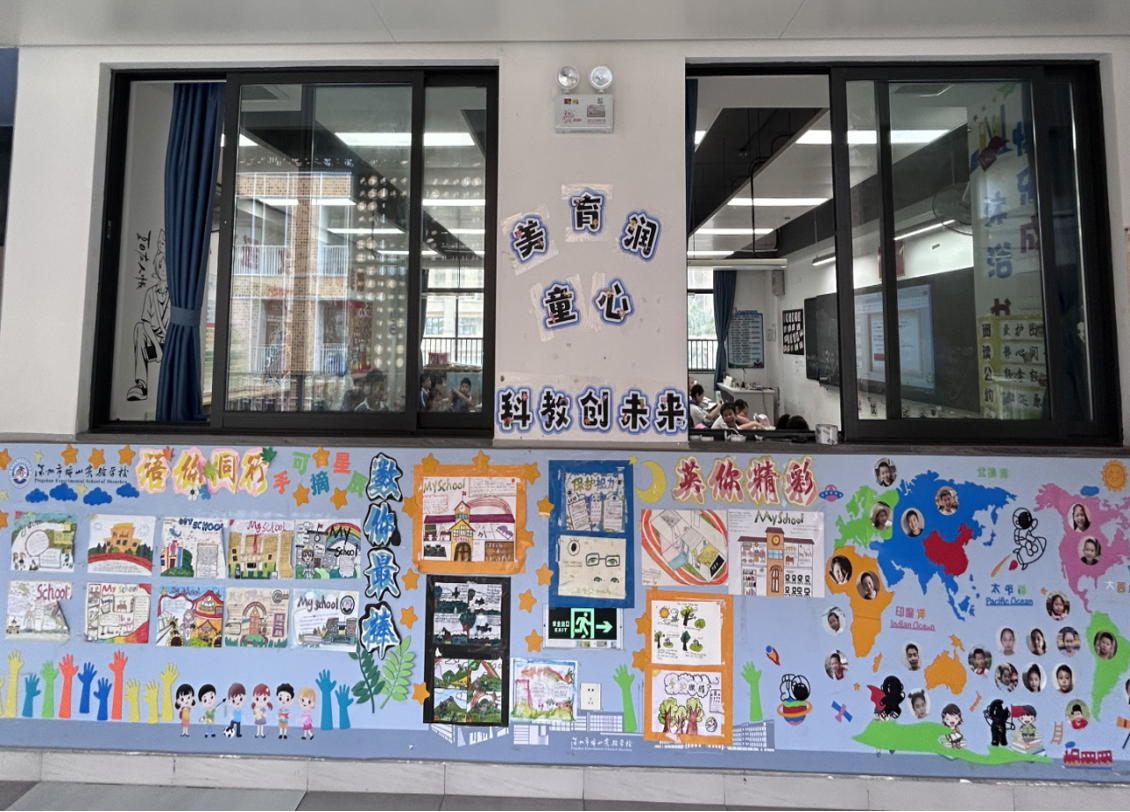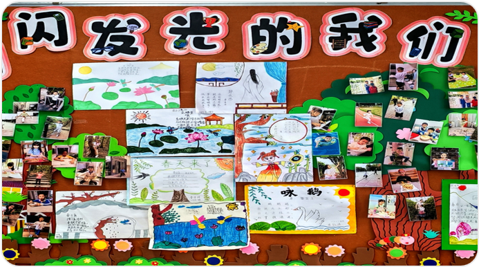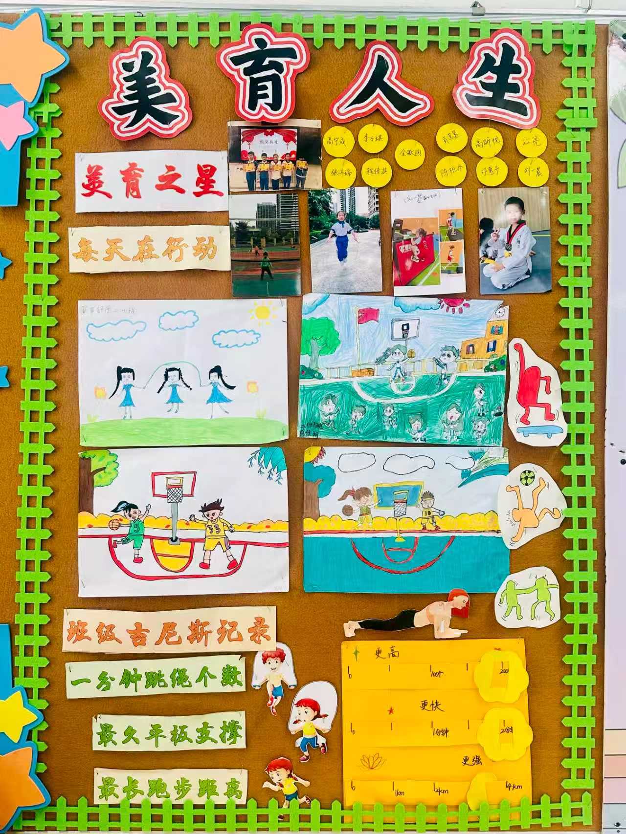 走进各班教室,“美事角” 陈列着学生劳动、绘画、体育等实践成果,走廊里的实践瞬间展板与教室窗台的中草药标本相映成趣,让校园每一处都成为可感可触的美育阵地。