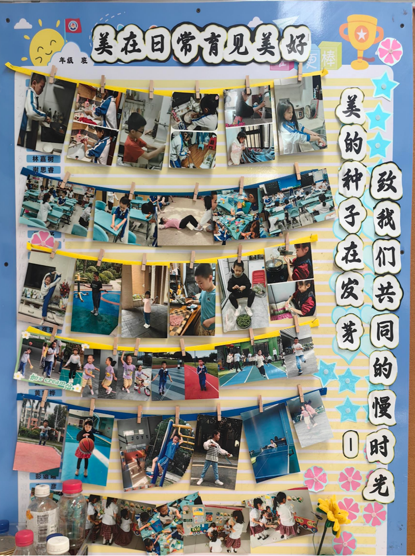 在此基础上,各班引导学生结合兴趣自主选定专属 “美育一件事”—— 赞美人、整理房间、每日阅读 1 小时、洗碗…… 这些张贴在班级 “美事角” 的 “小事儿”,既贴近生活、触手可及,又没有复杂要求,却让每个孩子的美育实践有了明确方向。