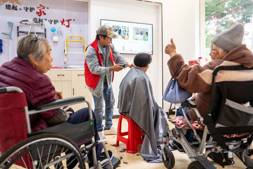 2025年11月6日,在湖南省长沙市望城区高塘岭街道湘陵社区,志愿者为老年人和残疾人士免费理发。新华社记者 陈思汗 摄