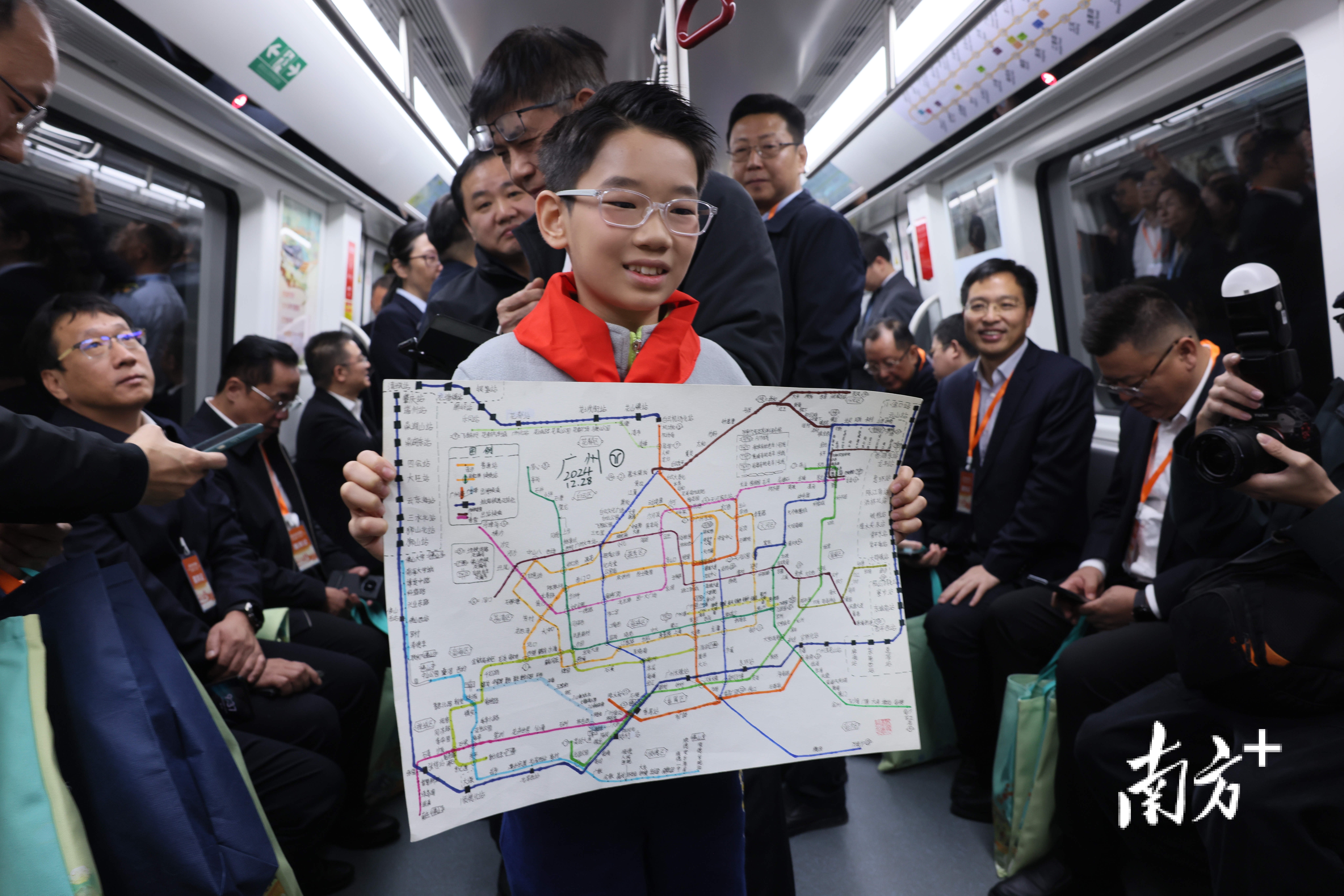 正在就读小学六年级的小“地铁迷”谈竟弘,带着自己手绘的广州地铁线路图来打卡,“我从7岁就喜欢了解地铁知识,平时坐地铁也会看地铁上的线路图,就尝试把它们画下来。”谈竟弘说,“我看到地铁十一号线每个站都很有特色,每个站都有广东的非遗元素。”